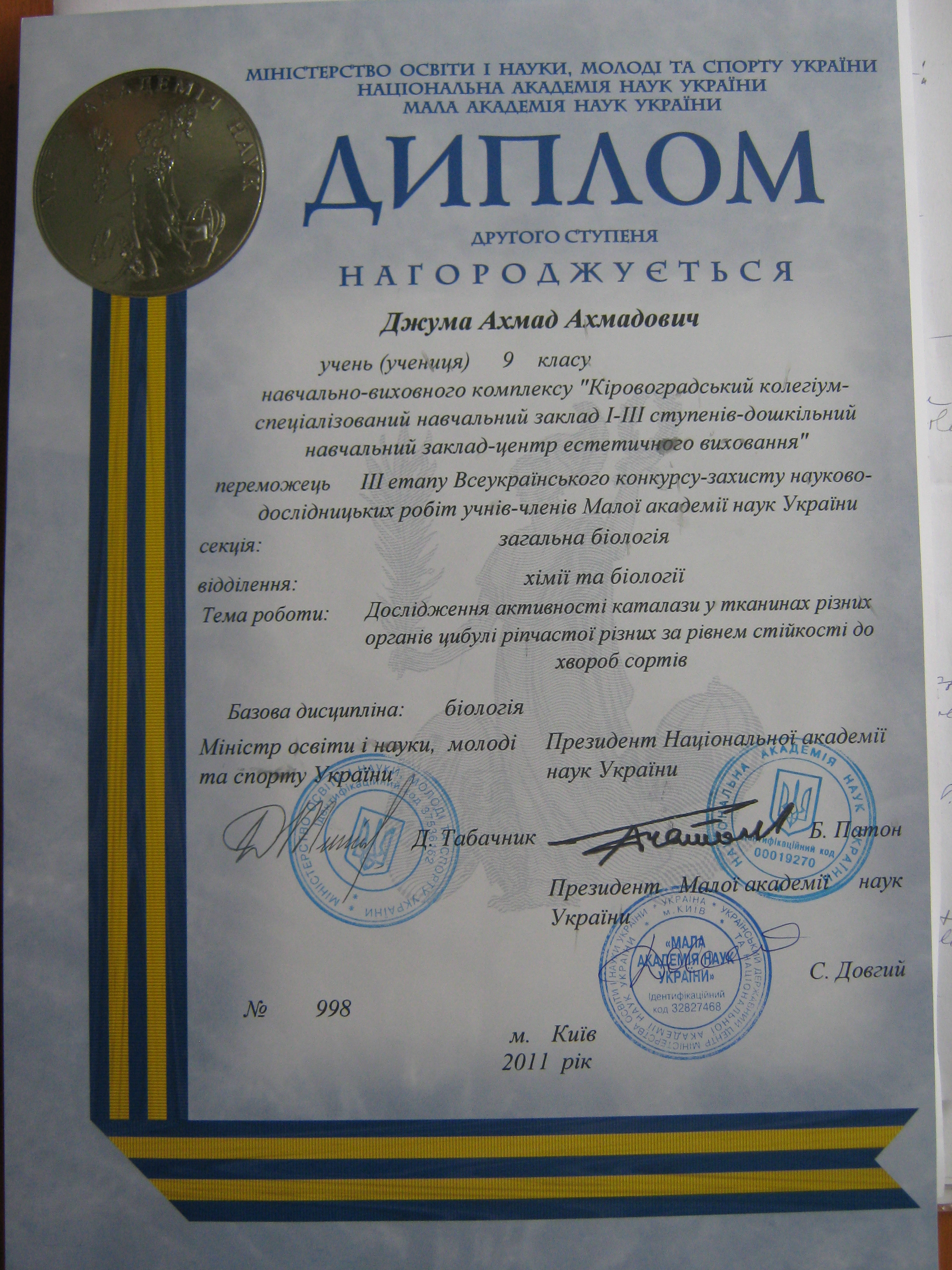 3.05-6.05 відбувся ІІІ етап Всеукраїнського конкурсу-захисту науково-дослідницьких робіт Учнів-членів Малої академії наук України, перемогу в якому отримав слухач Кіровоградського територіального відділення МАН Джума Ахмад Ахмадович. Незважаючи на те, що в секції загальної біології (розділ біохімія), були представлені роботи лише учнів 10-11 класів, Ахмад був єдиним дев’ятикласником який зумів блискуче виступити, виборовши диплом ІІ ступеня.
