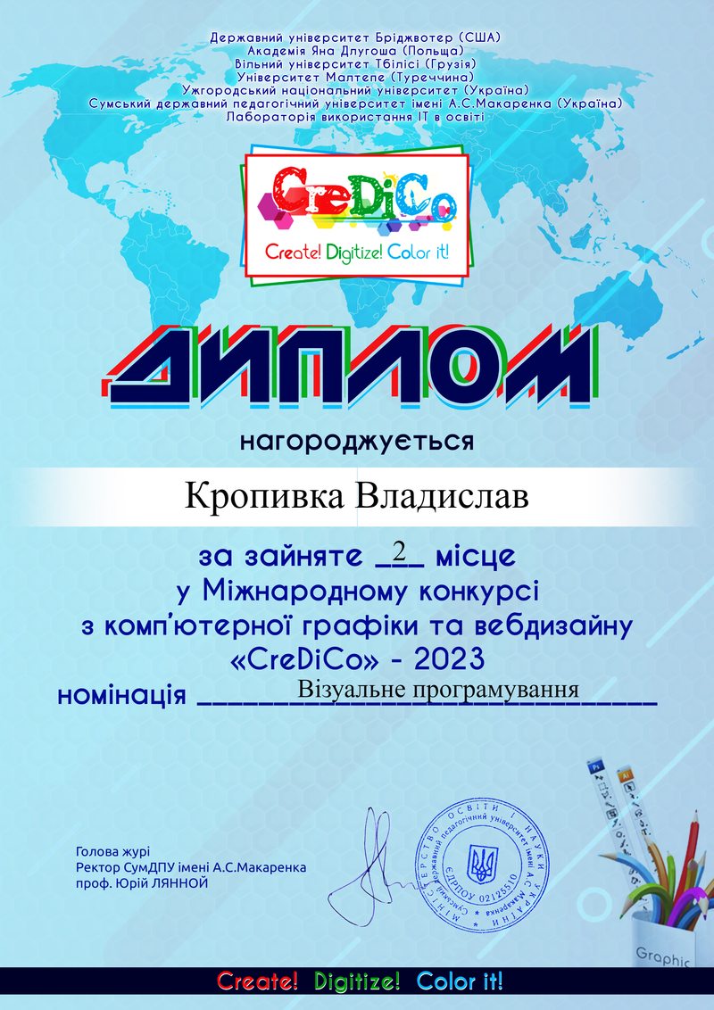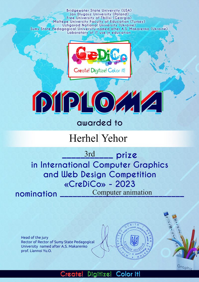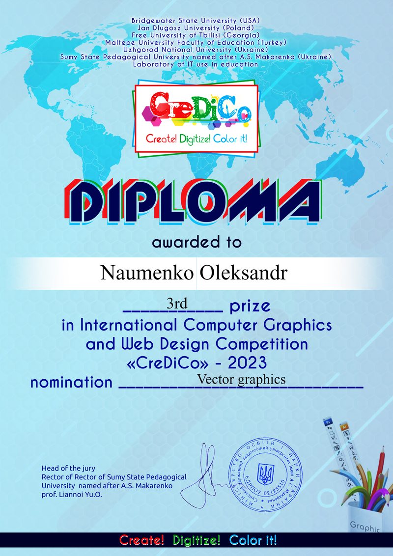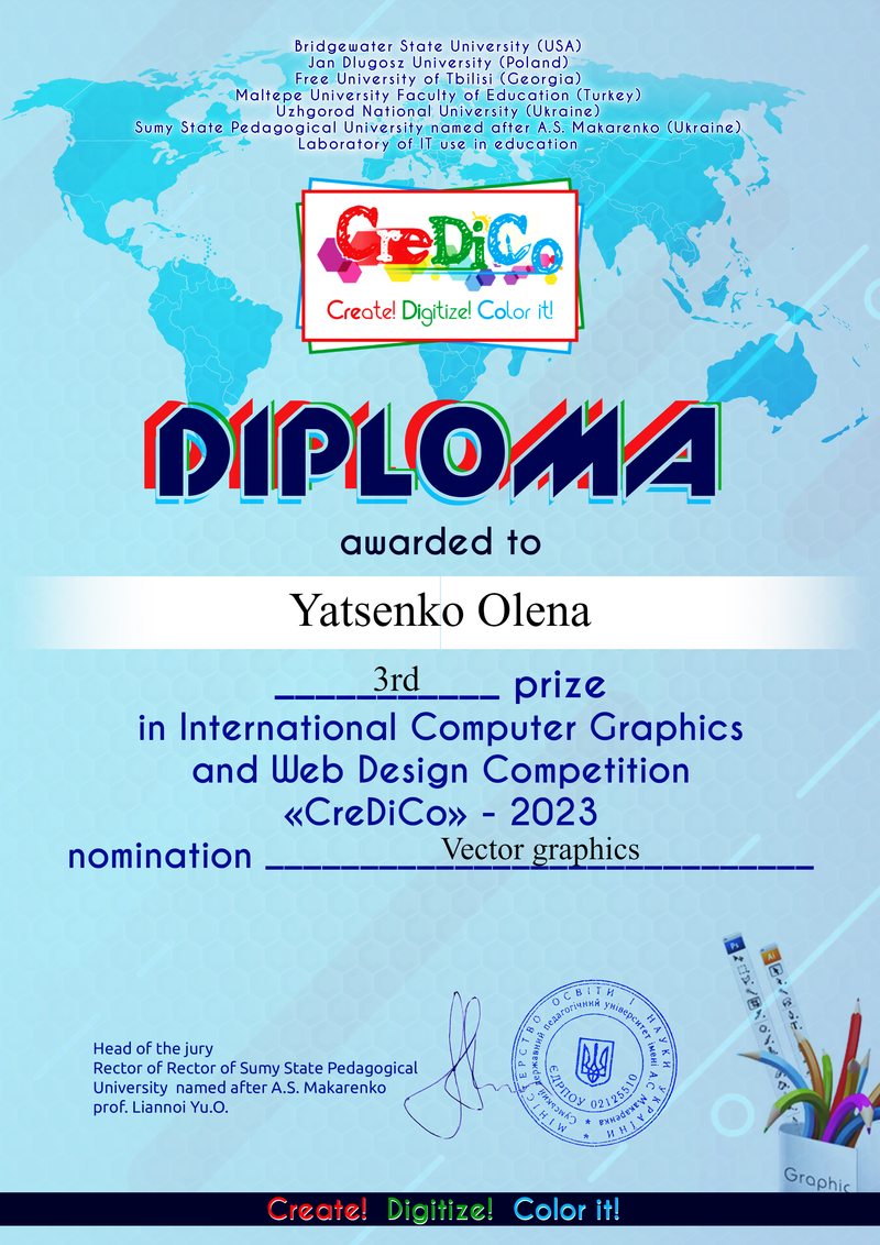 - Міжнародний конкурс з комп’ютерної графіки та вебдизайну «CreDiCo» - аж 8 призових місць: два перших місця, одне друге місце та п’ять третіх місць у різних номінаціях. Наші студенти взяли участь у конкурсі під керівництвом викладачів кафедри інформатики та інформаційних технологій: Людмили Дмитрівни Ганенко, Анни Валентинівни Пузікової, Світлани Олександрівни Шлянчак. Варто зазначити, що до конкурсу викладачі заохотили цілу низку спеціальностей: призові місця посіли студенти спеціальностей «Комп’ютерні науки», «Трудове навчання», «Цифрові технології» і навіть філологи. Докладніше про цей конкурс можна прочитати тут.
