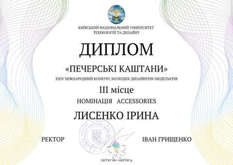 Є творчі здобутки й у сфері краси та дизайну. Так, слід відмітити почесне третє місце нашої студентки Ірини Лисенко (керівник – професор Чистякова Л.О.), яке вона посіла в Міжнародному конкурсі молодих дизайнерів «Печерські каштани».