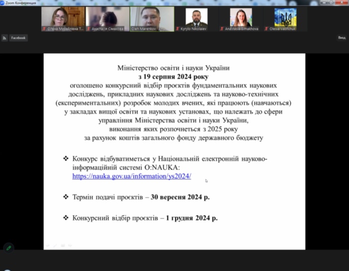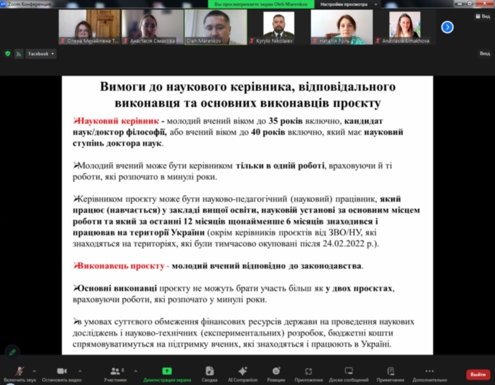 З метою популяризації інформації про конкурс та пояснення особливостей підготовки та подачі заявок 06 вересня 2024 р. Радою молодих вчених при МОНУ була організована онлайн-зустріч із проректором з наукової роботи Дніпровського національного університету імені Володимира Винниченка Олегом Маренковим. Олег Миколайович не тільки пояснив особливості участі у конкурсі, а й поділився власним досвідом участі в конкурсах проєктів. Учасником заходу стала д.пед.н., проф., завідувач кафедри математики та цифрових технологій Центральноукраїнського державного університету імені Володимира Винниченка Олена Трифонова.