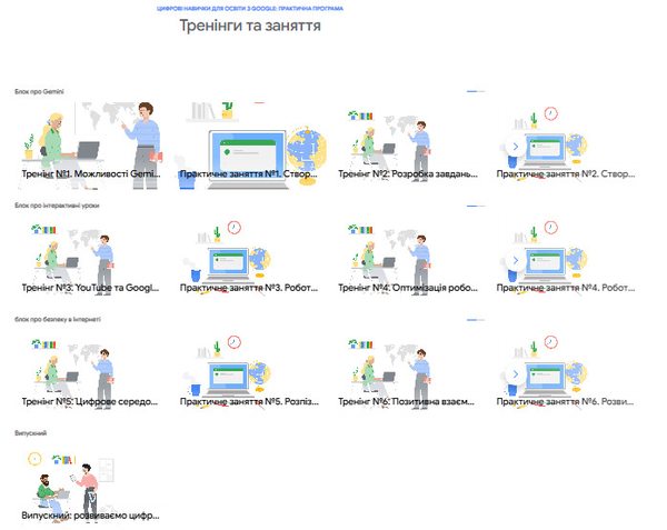 Онлайн-курс мав на меті сформувати вміння використовувати інструменти Google для організації, планування та здійснення освітнього процесу. Змістове наповнення курсу містило такі тематичні блоки: можливості Gemini для створення завдань; розробка завдань та схеми оцінювання з Gemini; YouTube та Google Презентації: інтерактивні уроки нового рівня; оптимізація роботи з Google Таблицями; цифрове середовище та принципи безпеки в Інтернеті; позитивна взаємодія в Інтернеті та відповідальне цифрове громадянство.