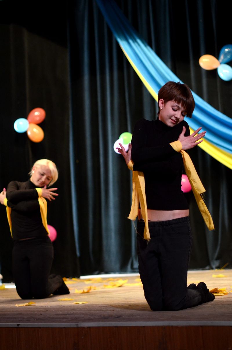 Був у нас навіть танець!!! Повірте, для філологічного факультету – це велике диво. Говорити уміємо гарно майже всі, і вірші пишемо в шухляди регулярно, і співаємо, якщо Бог розщедрився на хороший голос і слух, але танці – дивина. Ні,ну добре, що Кіровоград – танцювальна столиця України, але ж не настільки, щоб на філфаці вміли гарно танцювати! Я була щиро здивована. До того ж танцювали дівчата 2-го курсу і справді гарно. Знаєте, так ніжно, злегка уривчасто (як струни гітари звивалися під музику) і по-осінньому жовто. Навіть листочками клена обсипалися. Ех, люблю осінь!