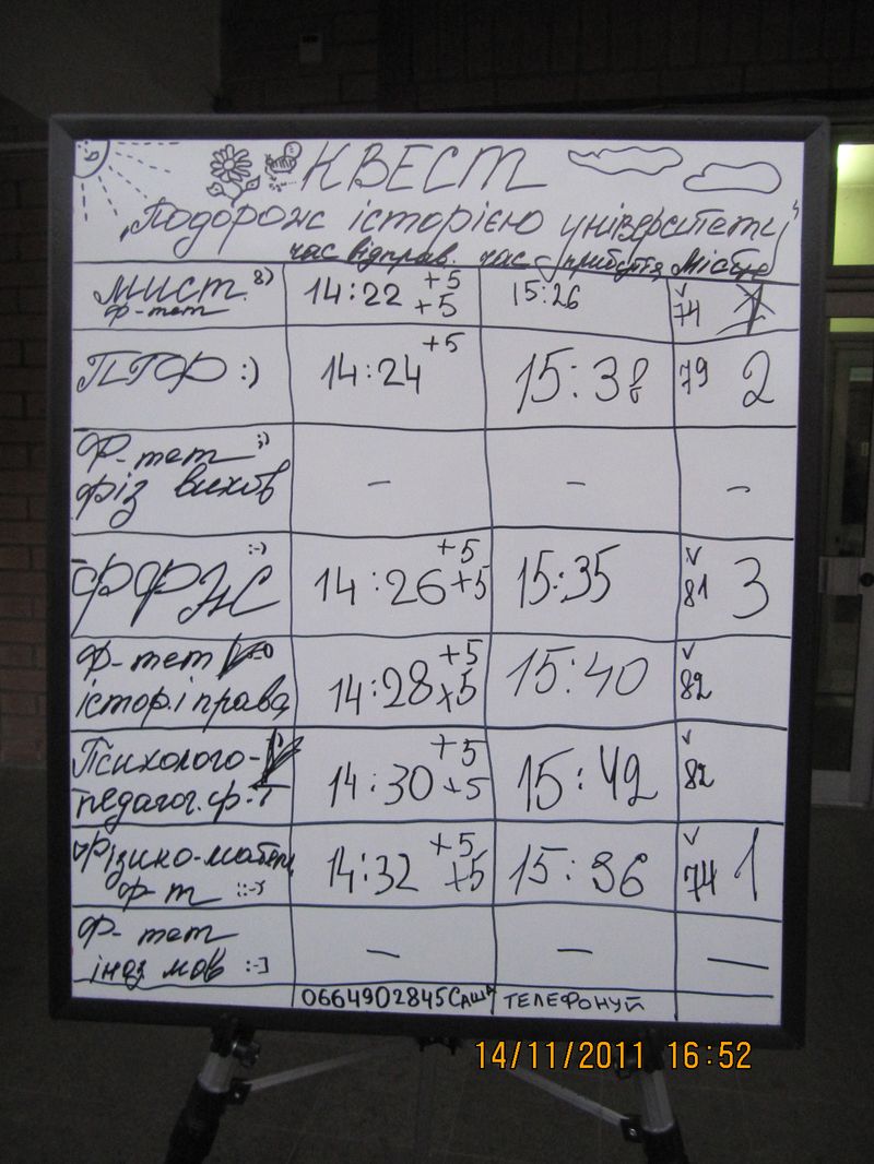 У квесті прийняли участь студенти фізико-математичного, природничо-географічного, психолого-педагогічного, мистецького факультету, факультету філології та журналістики, історії та права. Учасникам заходу було запропоновано цікаві логічні загадки та завдання пов'язані з історією нашого рідного університету. Студенти отримали масу задоволення, а переможці – солодкі подарунки.