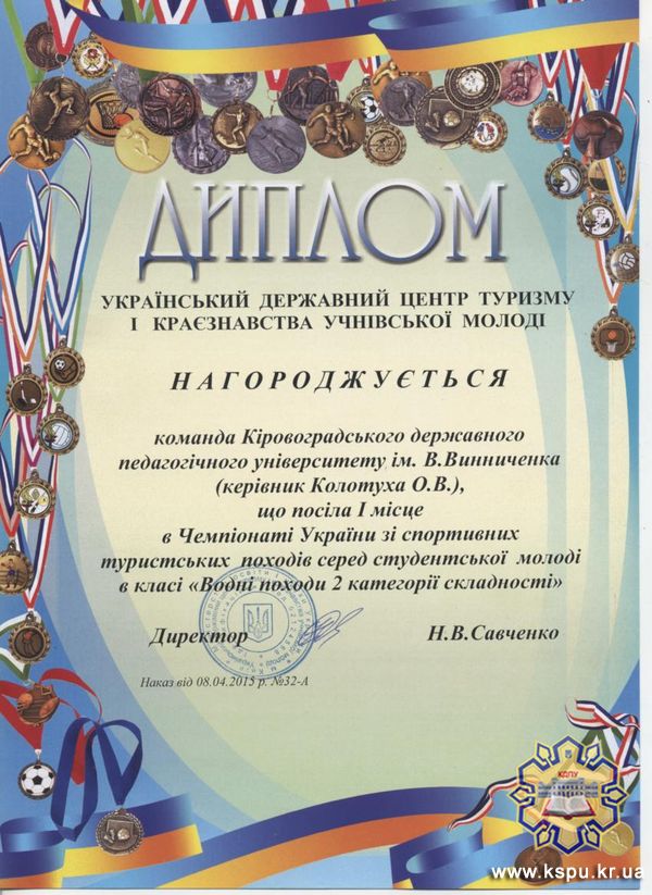 І місце серед водних походів ІІ категорії складності посіла туристська група турклубу «Мандри» КДПУ під керівництвом майстра спорту Колотухи О.В., яка у травні 2014 року здійснила водний похід на катамаранах по найскладніших річках Карпат і України – Чорному Черемошу, Черемошу та Пруту. Чемпіонами України стали викладач кафедри географії Онищенко Є.В., студенти-географи Руслана Синельникова, Вікторія Павлуша, Юрій Кірілов, Костянтин та Денис Базишен, випускники факультету історії і права Василь Штанденко, Іван Ващенко, Андрій Пропадущий та студентка Київського медуніверситету Оксана Бабаєва.