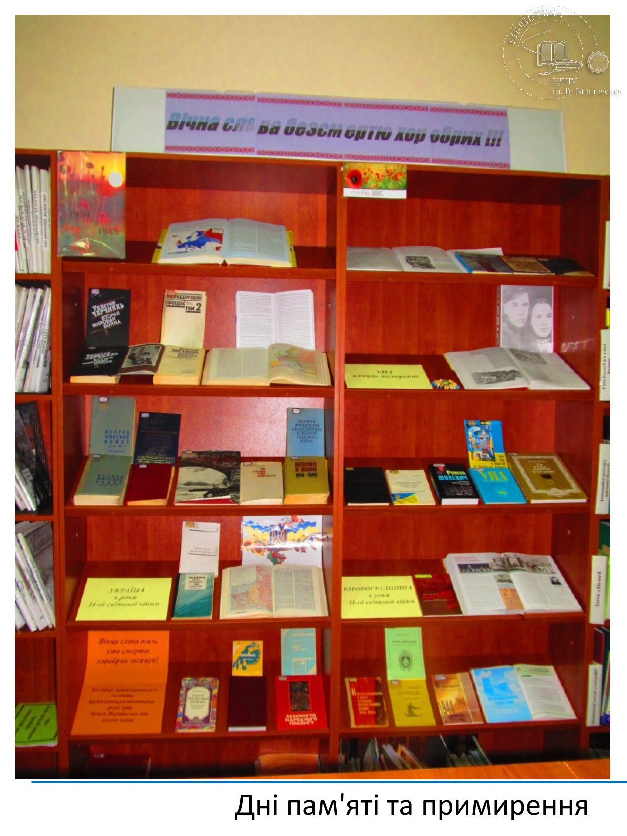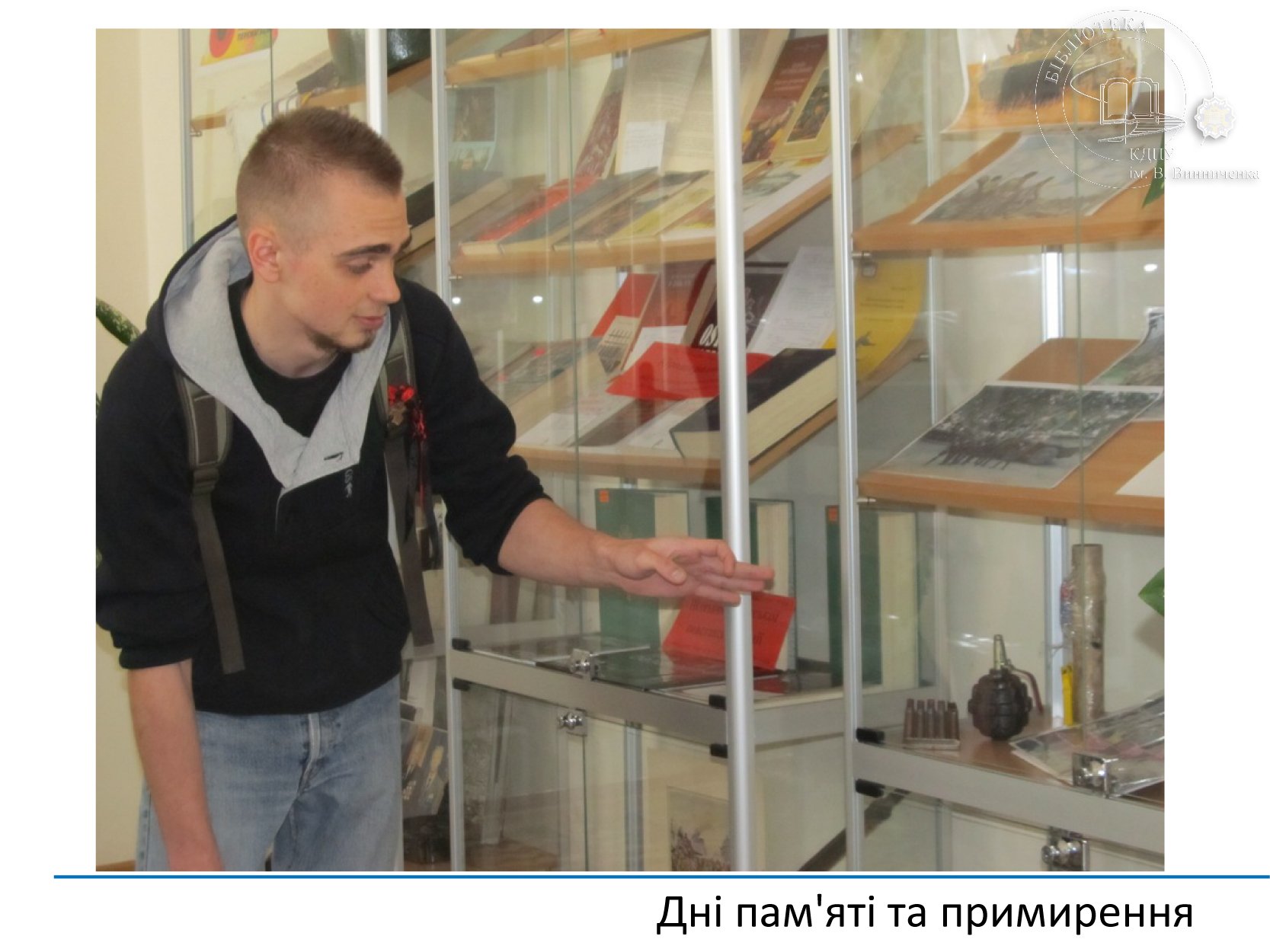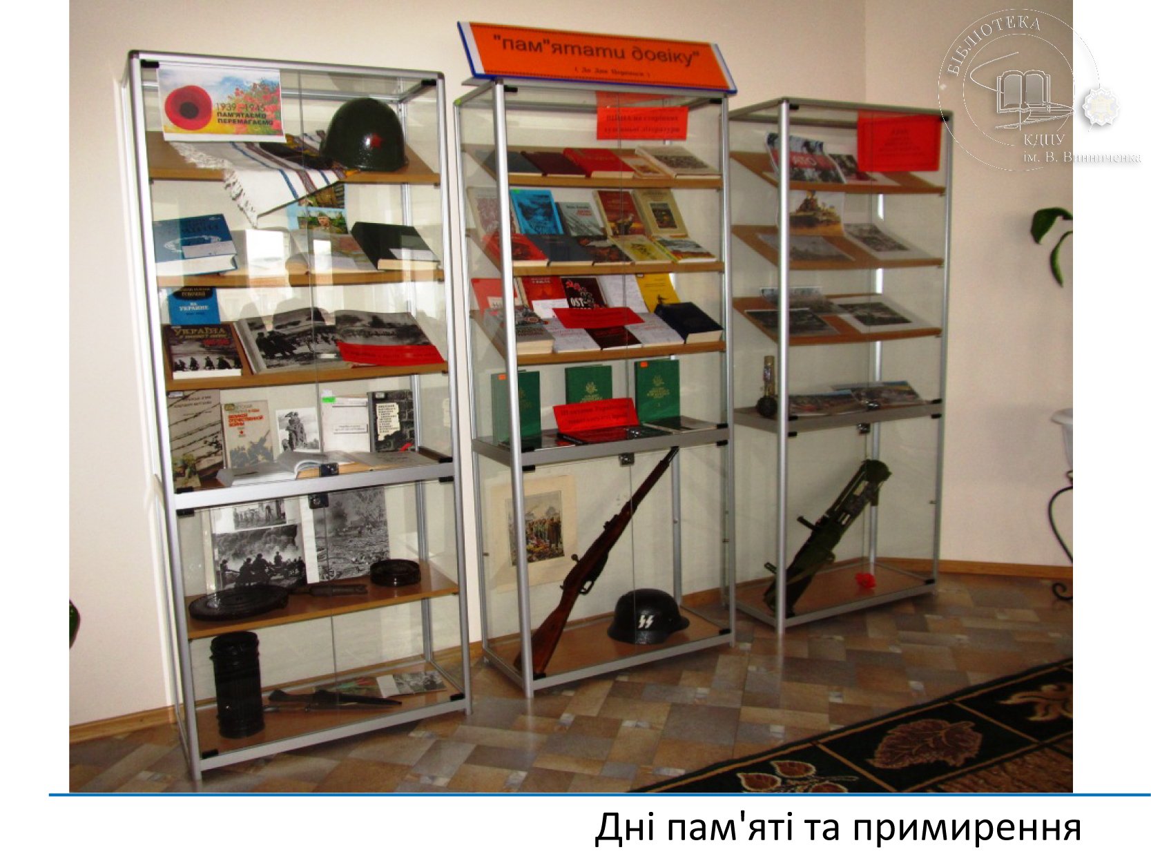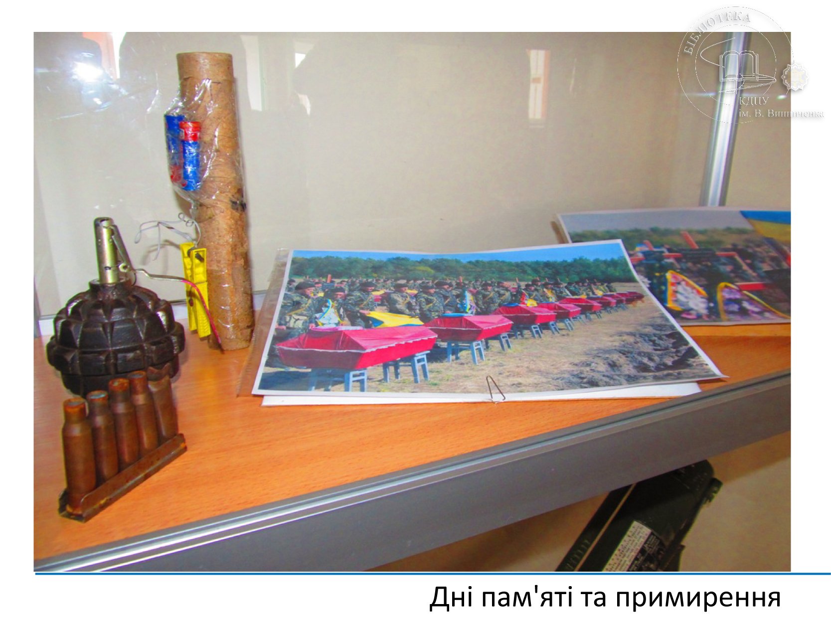 Завітавши на виставки, читач не залишиться байдужим, адже кожна книга несе в собі пам’ять про загиблих, дух патріотизму, нескореність і перемогу, а також пропонуються увазі предмети військового озброєння Другої світової війни та зони АТО.