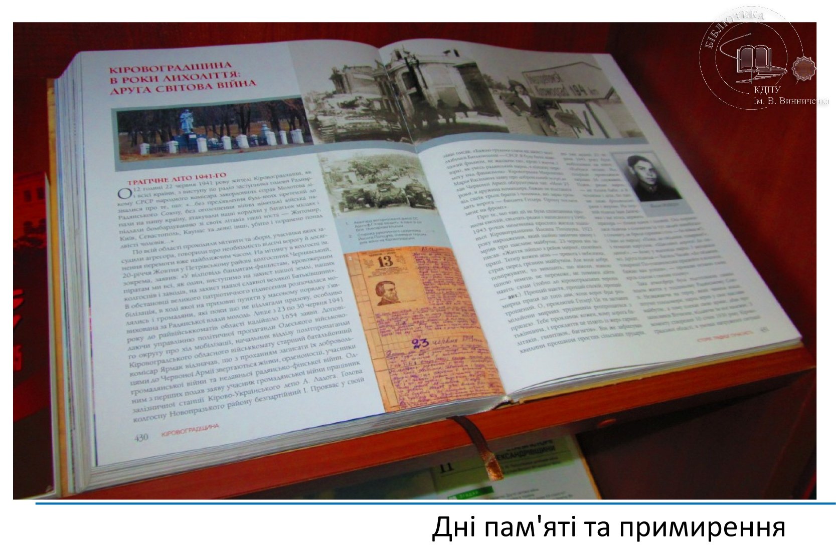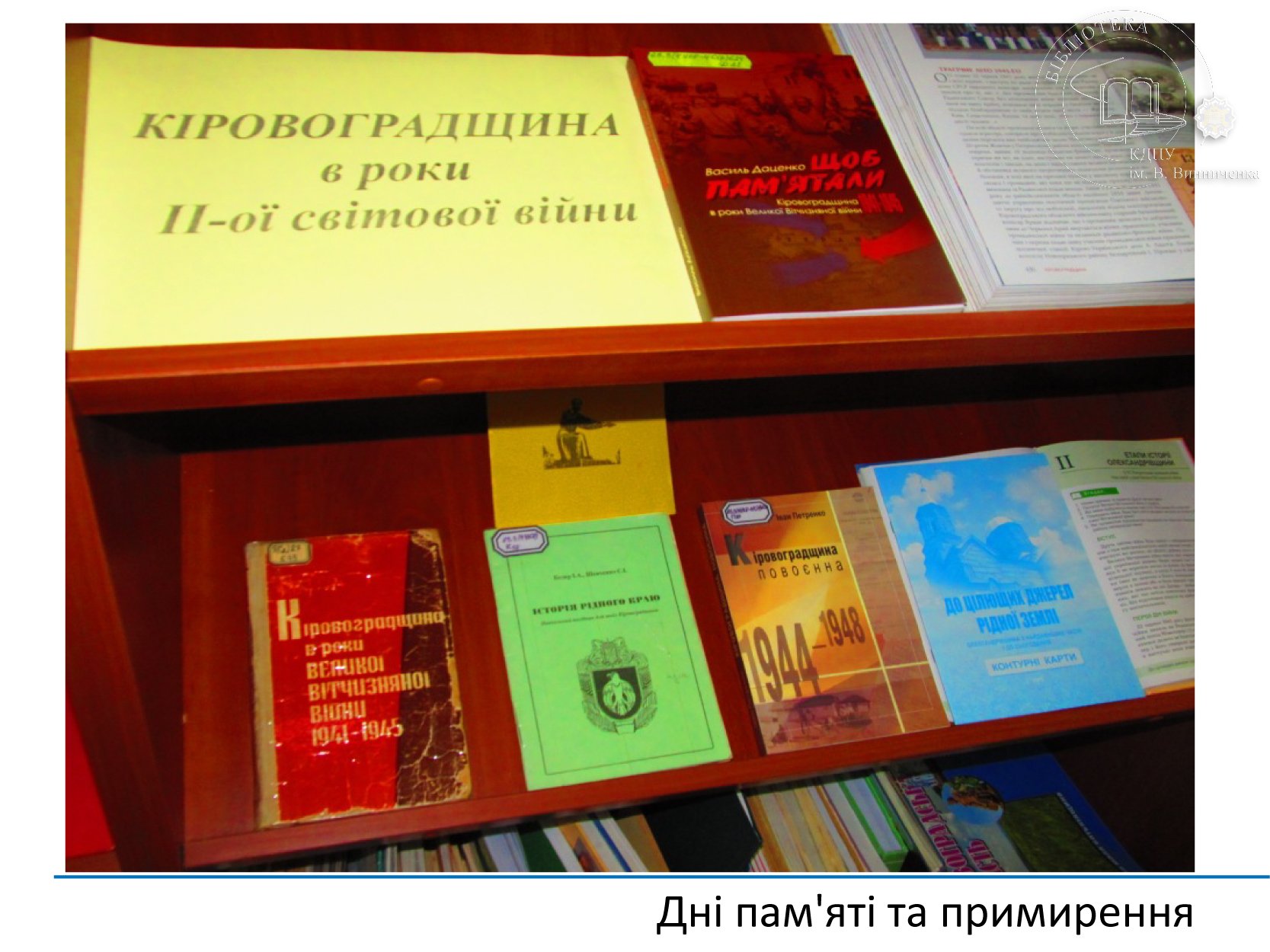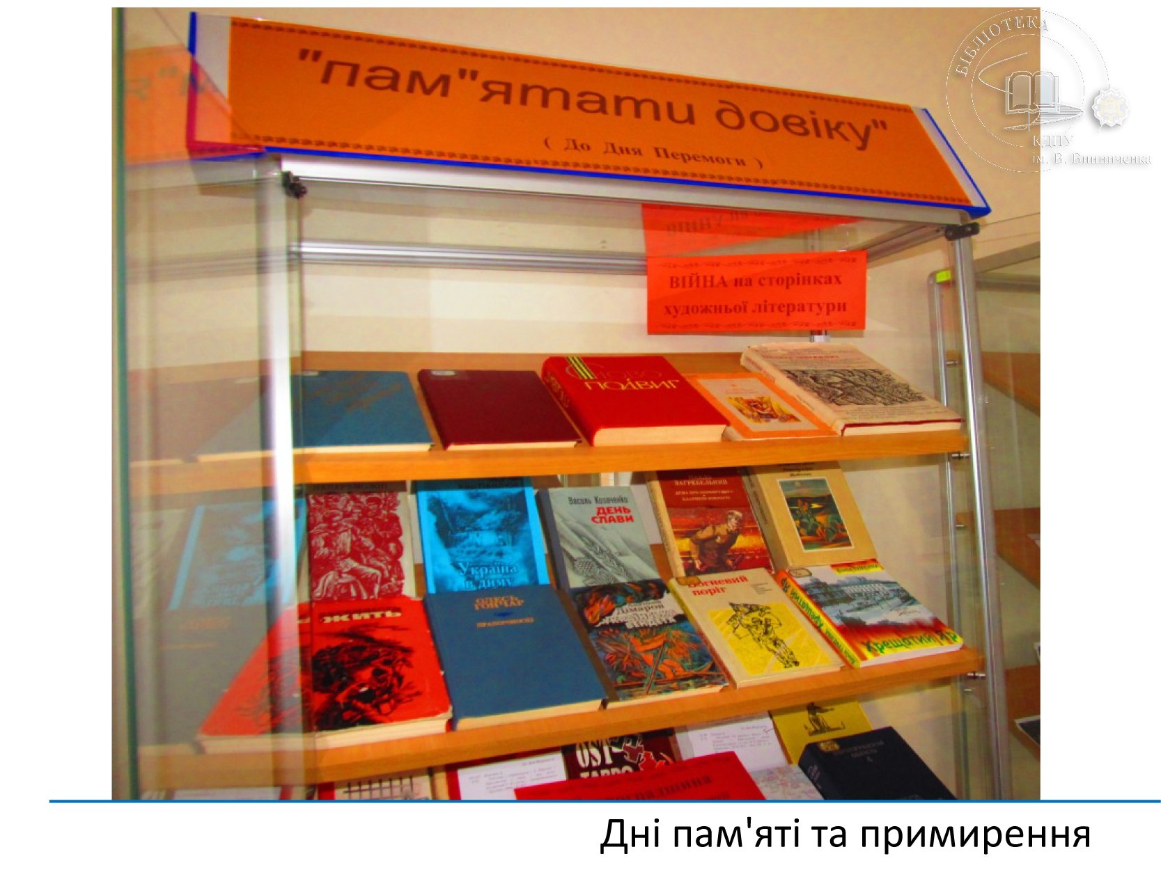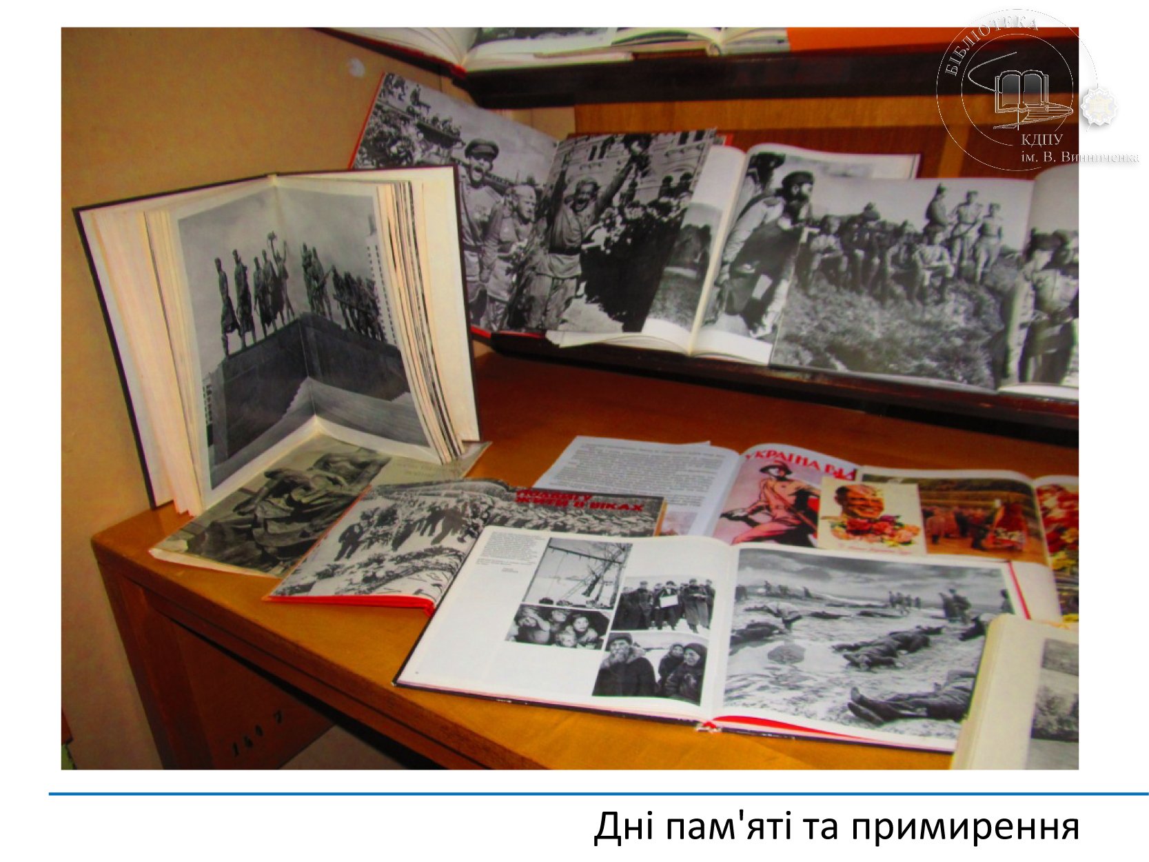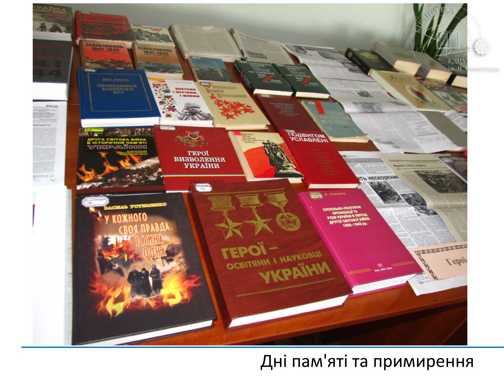 Завітавши на виставки, читач не залишиться байдужим, адже кожна книга несе в собі пам’ять про загиблих, дух патріотизму, нескореність і перемогу, а також пропонуються увазі предмети військового озброєння Другої світової війни та зони АТО.