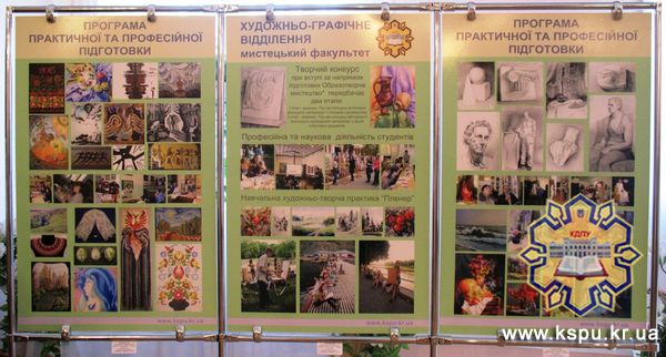 На чільному місті експонується серія рекламно-інформативних плакатів «Стань студентом – навчайся мистецтву» Єрьоміної Л.В. (комп’ютерна графіка) про навчання студентів художньо-графічного відділення мистецького факультету Кіровоградського державного педагогічного університету імені Володимира Винниченка (керівник: Фурсикова Т.В. - кандидат педагогічних наук, доцент кафедри хореографічних дисциплін образотворчого мистецтва та дизайну).