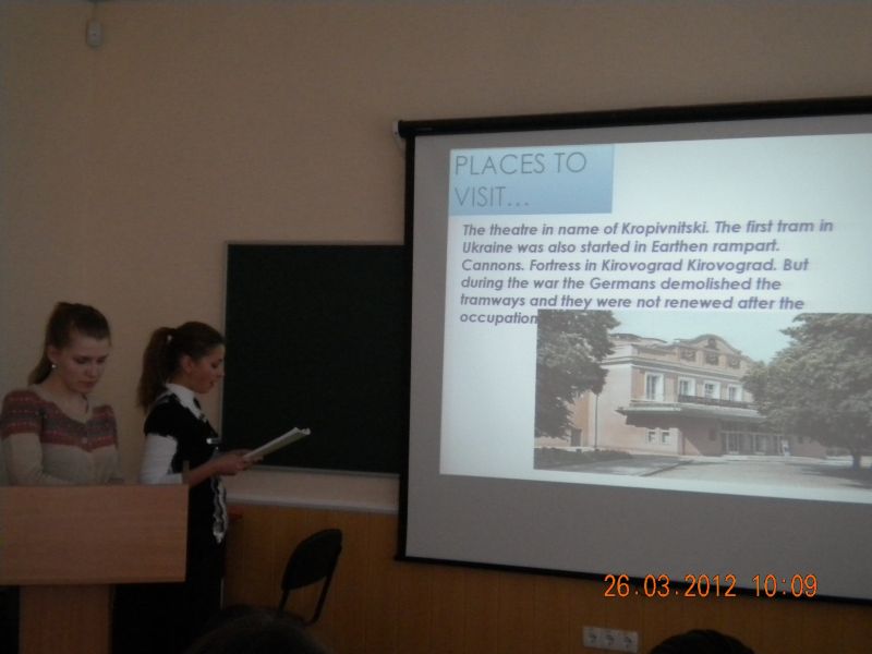 До останнього моменту ми були в «незнанні», чекаючи невідоме. І тут відкриваються двері в аудиторію, заходить наш викладач і з нею гість. Це був приємний чоловік з емблемою оксфордського університету на краватці. Він трішки розповів про себе, і ми почали представляти наші презентації. Усі страхи розвіялись після перших виступів, в яких йшлося про Крим. Далі студенти вже виступали з більшою впевненістю. Було розказано про Київ, Ялту, Львів, Одесу і, звичайно, про танцювальну столицю України — Кіровоград.