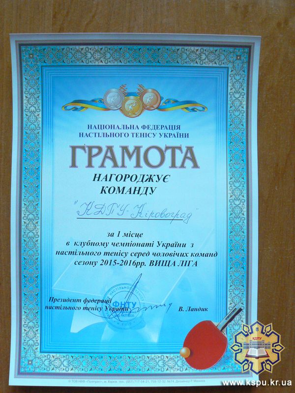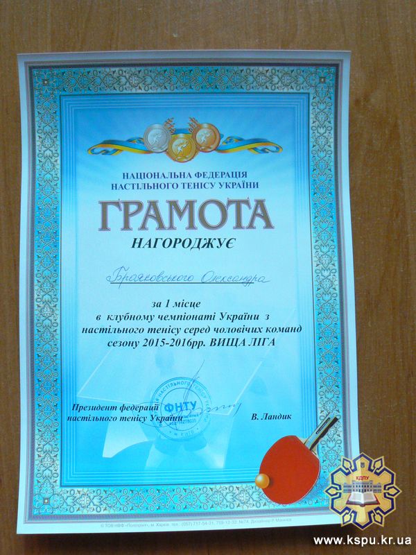 26-30 квітня 2016 року в м. Ровно відбувся останній тур клубного чемпіонату України з настільного тенісу серед чоловічих команд Вищої ліги. Команда «КДПУ – Кіровоград» посіла І місце і виборола право в наступному сезоні представляти наш вищий навчальний заклад і місто в Супер лізі. У складі команди брав участь кандидат педагогічних наук, старший викладач кафедри теорії та методики олімпійського і професійного спорту факультету фізичного виховання Олександр Вікторович Брояковський, який є граючим тренером команди «КДПУ – Кіровоград», капітаном та діючим спортсменом.