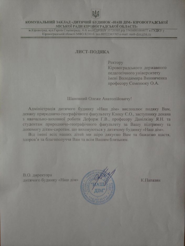 14 червня 2012 року студенти природничо-географічного факультету відвідали Кіровоградський дитячий будинок «Наш дім».