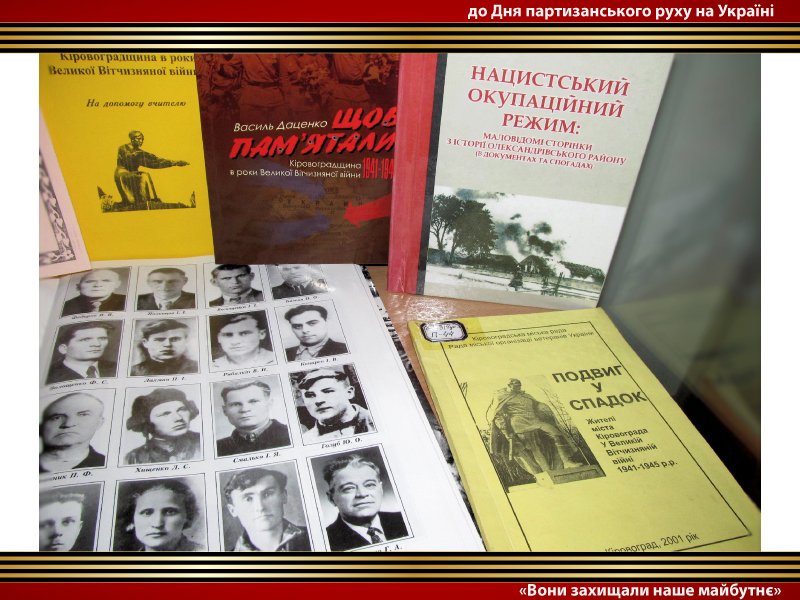 До уваги читачів представлені книги краєзнавців: С. Шевченка «Кіровоградщина в роки Великої Вітчизняної війни», В. Доценка «Щоб пам’ятали», І. Петренка «Нацистський окупаційний режим», Ю. Матівоса «Сторінки безсмертя», а також книги Пам’яті і Скорботи України, присвячені Кіровоградській області.