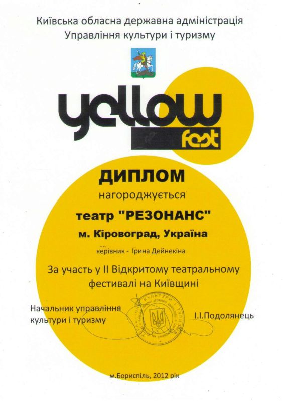 Театральний колектив молодіжного театру «Резонанс» ім. Валерія Дейнекіна (КГПУ ім.. В.Винниченка) отримав, окрім диплому почесних учасників, диплом «Найкращий ансамбль» з відзнакою за найуспішніший акторський склад. Повернулися з хорошим настроєм, масою позитивних вражень. Ми на фесті знайшли друзів які хворіють тією ж хворобою, що й ми, мають такі ж погляди на театральне мистецтво, мають такі ж самі проблеми і головне, що мають той самий запал, натхнення і бажання продовжувати розвиватися і радувати свого глядача.