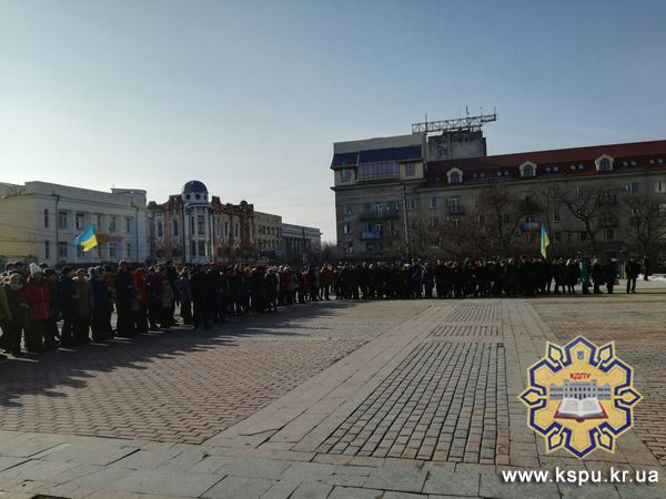 Сьогодні, 20 лютого, на площі Героїв Майдану вшановували пам'ять Героїв Небесної Сотні. Студенти Кіровоградського державного педагогічного університету імені Володимира Винниченка, зокрема, студенти факультеті історії та права, долучилися до мітингу та поклали квіти до пам'яної дошки зі світлинами Героя України Віктора Чміленка.