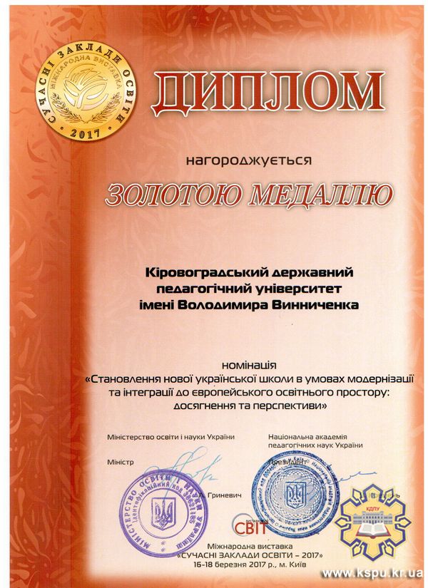 Гордість викликає результат виставки – ЗОЛОТА МЕДАЛЬ у номінації «Становлення нової української школи в умовах модернізації та інтеграції до європейського освітнього простору: досягнення та перспективи». Особлива подяка від ректорату викладачам, чиї роботи, подані на розгляд поважного журі з представників МОН України та НАПН України, разом зі здобутками вишу в усіх сферах його діяльності і послужили запорукою високої нагороди.