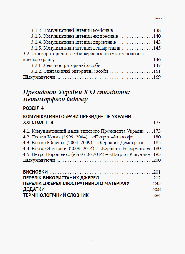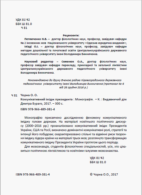 Монографію присвячено дослідженню феномену комунікативного іміджу глави держави. На матеріалі новітнього політичного дискурсу (2000–2016 рр.) проаналізовано комунікативний імідж Президентів України, США та Росії, визначено домінантні комунікативні ролі, стратегії та інтенції його побудови; схарактеризовано спільні та відмінні риси творення іміджу лідера країни на матеріалі трьох мов; розглянуто трансформацію комунікативного іміджу українського Перезидента протягом цього періоду.