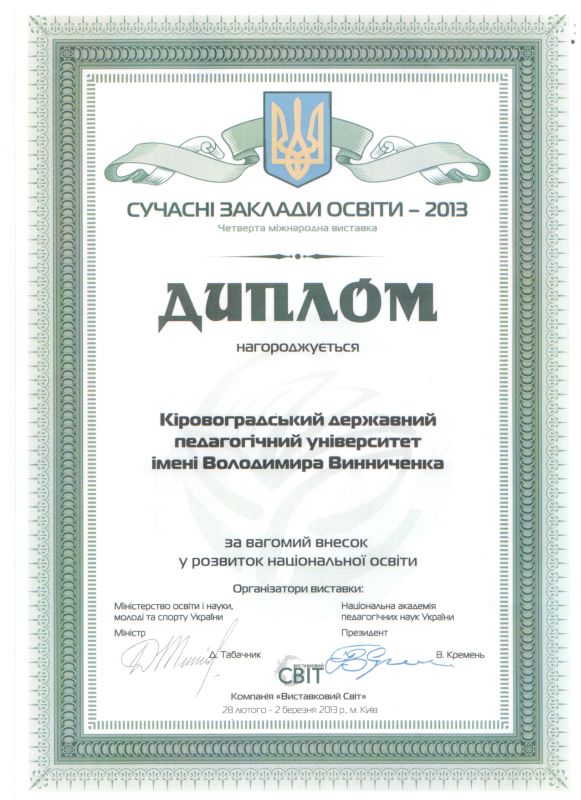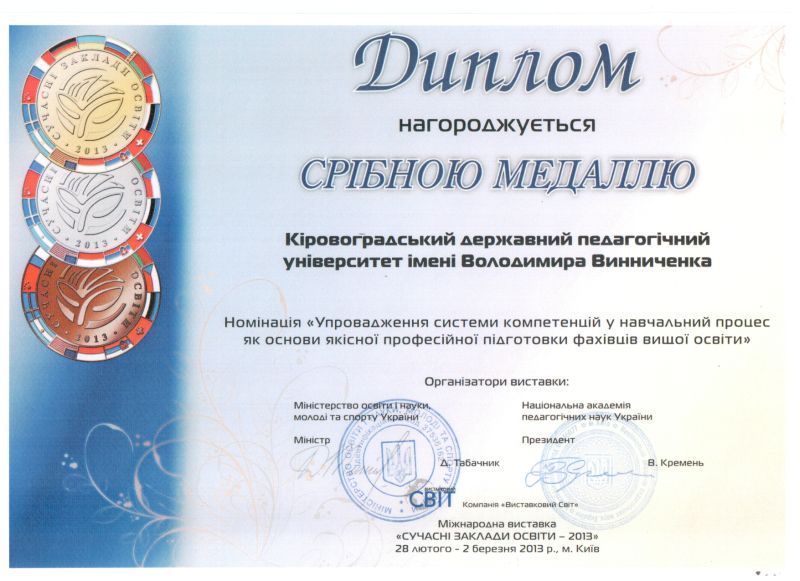 Кіровоградський державний педагогічний університет імені Володимира Винниченка виборов срібну медаль у номінації “Упровадження системи компетенцій у навчальний процес як основи якісної професійної підготовки фахівців вищої освіти” та був нагороджений дипломом за вагомий внесок у розвиток національної освіти. Почесною грамотою нагороджено ректора КДПУ ім. В.Винниченка проф. О.А. Семенюка за особистий внесок у зміцнення освітнього потенціалу України.