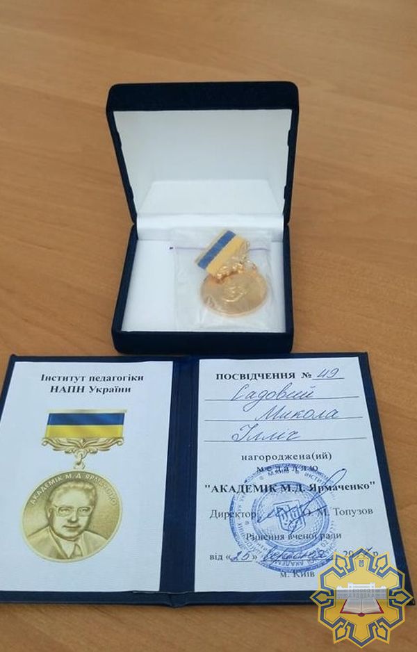 Професору Садовому М.І. з нагоди 70-річчя та за вагомі наукові здобутки у галузі педагогіки й методики навчання підростаючого покоління було вручено нагороду Інституту педагогіки НАПН України - медаль Миколи Ярмаченка.