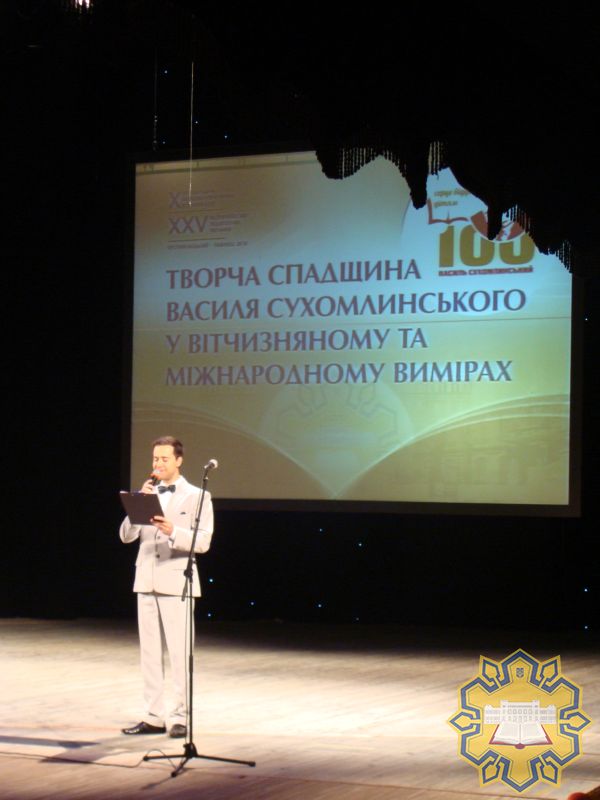 Заходи з ушанування всесвітньо відомого педагога та гуманіста Василя Олександровича Сухомлинського розпочалися з урочистостей та пленарного засідання в Обласному академічному музично-драматичному театрі імені М.Л. Кропивницького. Після мистецької замальовки «Павлиські казки» на сцену піднялися голова Кіровоградської обласної ради Олександр Чорноіваненко та заступниця голови обласної державної адміністрації Світлана Лобанова, які звернулися з привітальним словом до гостей наукового зібрання з усіх куточків України і з-за кордону та вручили грамоти й подяки Міністерства освіти та науки України, а також надзвичайно почесну відзнаку Нагрудний знак «Василь Сухомлинський». Крім того, були зачитані вітання від Голови Верховної Ради України та комітету з питань освіти й науки ВР, Європейської академії імені Януша Корчака (м. Мюнхен); спеціальний ролик для учасників зібрання записав ад’юнкт-дослідник з Університету Монаш (Мельбурн, Австралія) Алан Кокерілл.