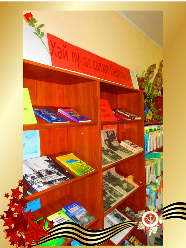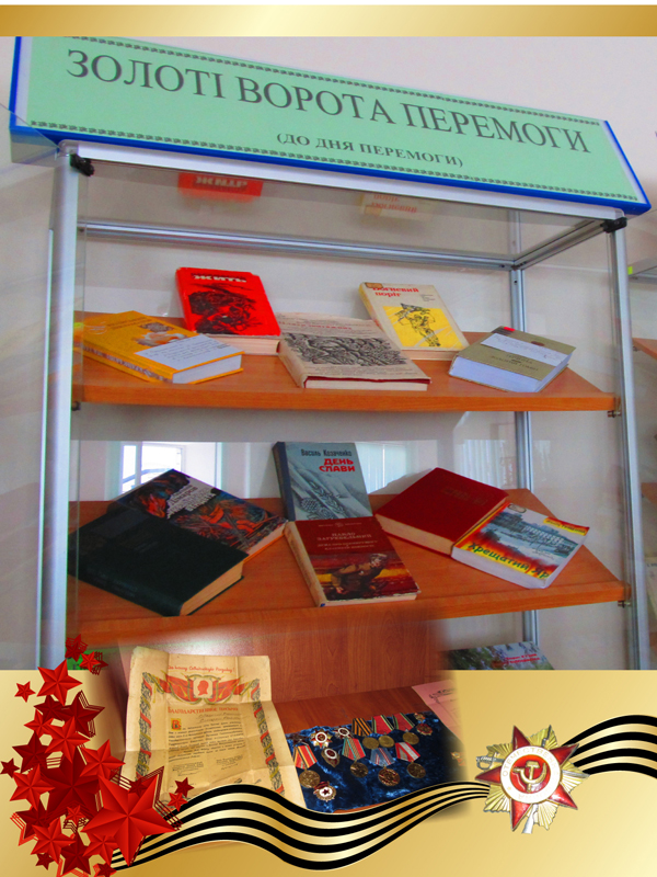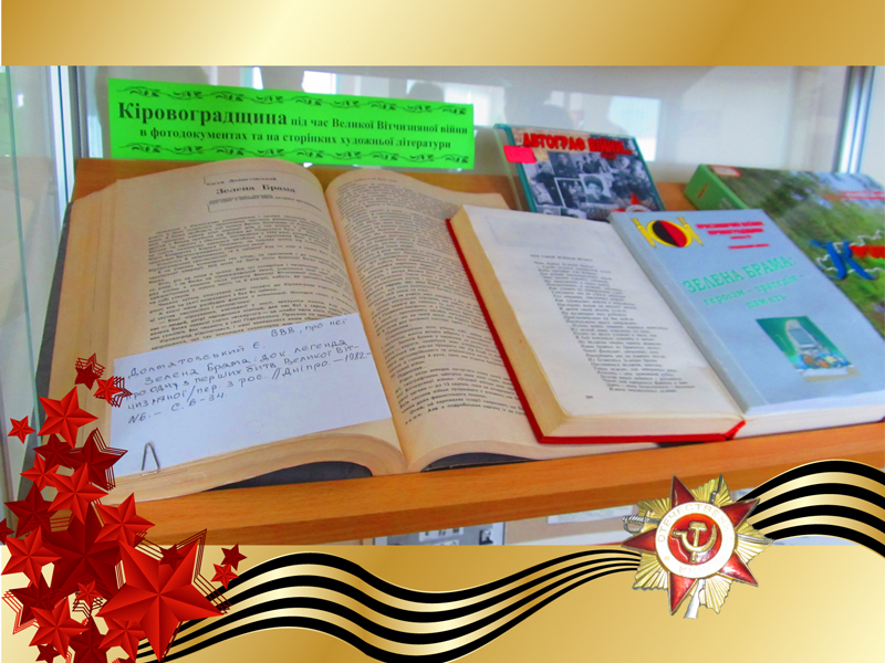 До уваги читачів у філологічному залі представлено виставку-панораму “Золоті ворота Перемоги”, що експонує поетичні та прозові твори письменників воєнних та повоєнних років, фото- та відео-матеріали «Кіровоградщина під час Великої Вітчизняної війни».