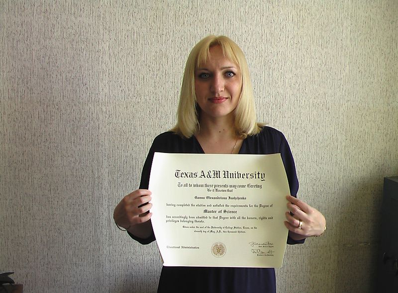 Упродовж двох академічних років я проходила стажування в Університеті штату Техас, США, яке було надане за підтримкою програми академічних обмінів імені Фулбрайта. Метою стажування було підвищення кваліфікації в галузі вищої освіти й виконання магістерської програми зі спеціальності Управління вищої школи. Зазначена програма передбачала відвідування занять з основ управління, фінансування, права та методики викладання у вищих навчальних закладів, а також співпрацю з викладачами, розробку спільних проектів, участь у семінарах, зустрічі зі студентами.