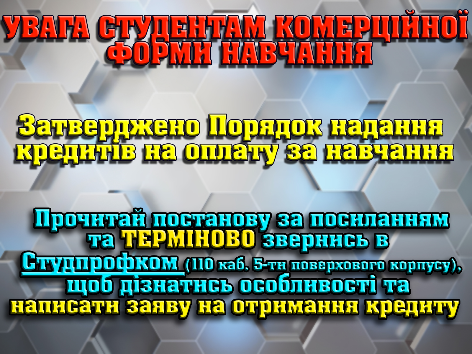Усі студенти денної та заочної комерційної форми навчання за постановою Кабінету Міністрів України №673 від 29 серпня 2018 року мають право отримати кредит на навчання за пільговими умовами!