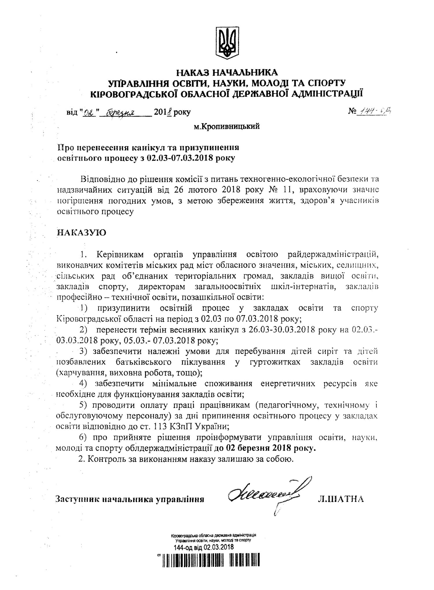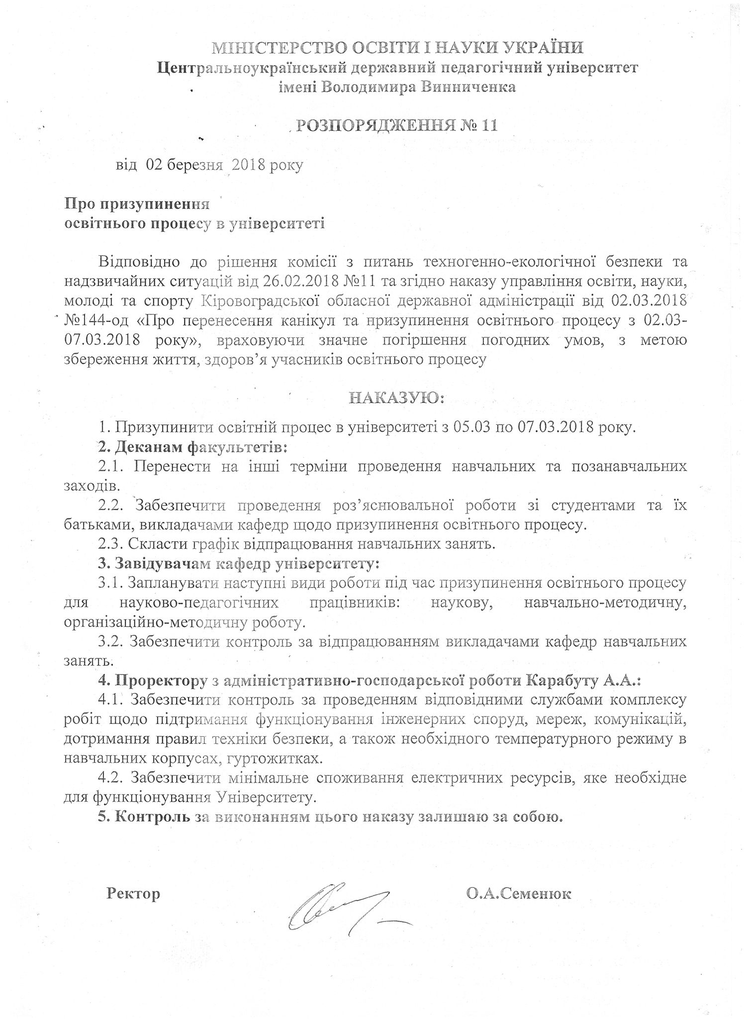 Відповідно до рішення комісії з питань техногенно-екологічної безпеки та надзвичайних ситуацій від 26.02.2018 №11 та згідно наказу управління освіти, науки, молоді та спорту Кіровоградської обласної державної адміністрації від 02.03.2018 №144-од «Про перенесення канікул та призупинення освітнього процесу з 02.03-07.03.2018 року», враховуючи значне погіршення погодних умов, з метою збереження життя, здоров'я учасників освітнього процесу розпорядженням ректора від 02 березня 2018 року призупинено освітній процес в Університеті з 05.03.2018 по 07.03.2018 року.