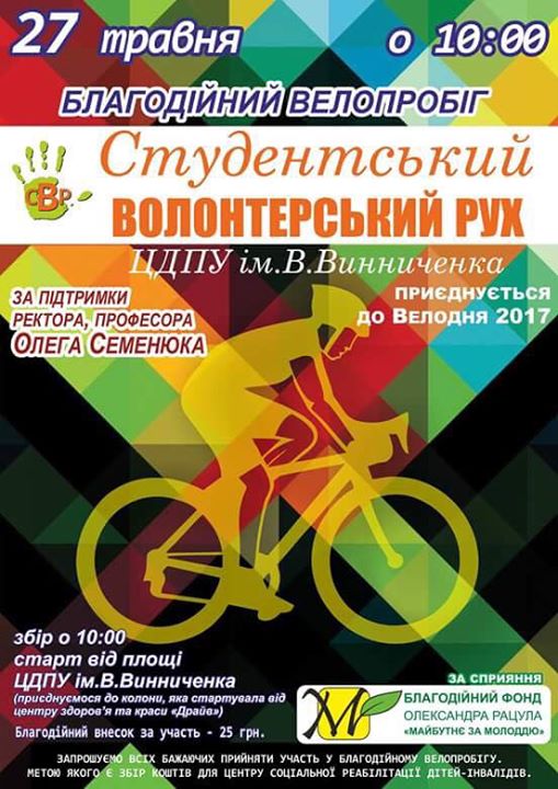 Вже цієї суботи, 27 травня, о 10 годині відбудеться яскрава подія для всіх. Студентський волонтерський рух Центральноукраїнського державного педагогічного університету імені Володимира Винниченка запрошує долучитися до благодійного веломарафону. Реєстрація учасників та початок збору — на площі ЦДПУ ім. В. Винниченка. На Вас чекає можливість пофотографуватися та подивитися фотовиставку робіт, а також долучитися до ярмарку!