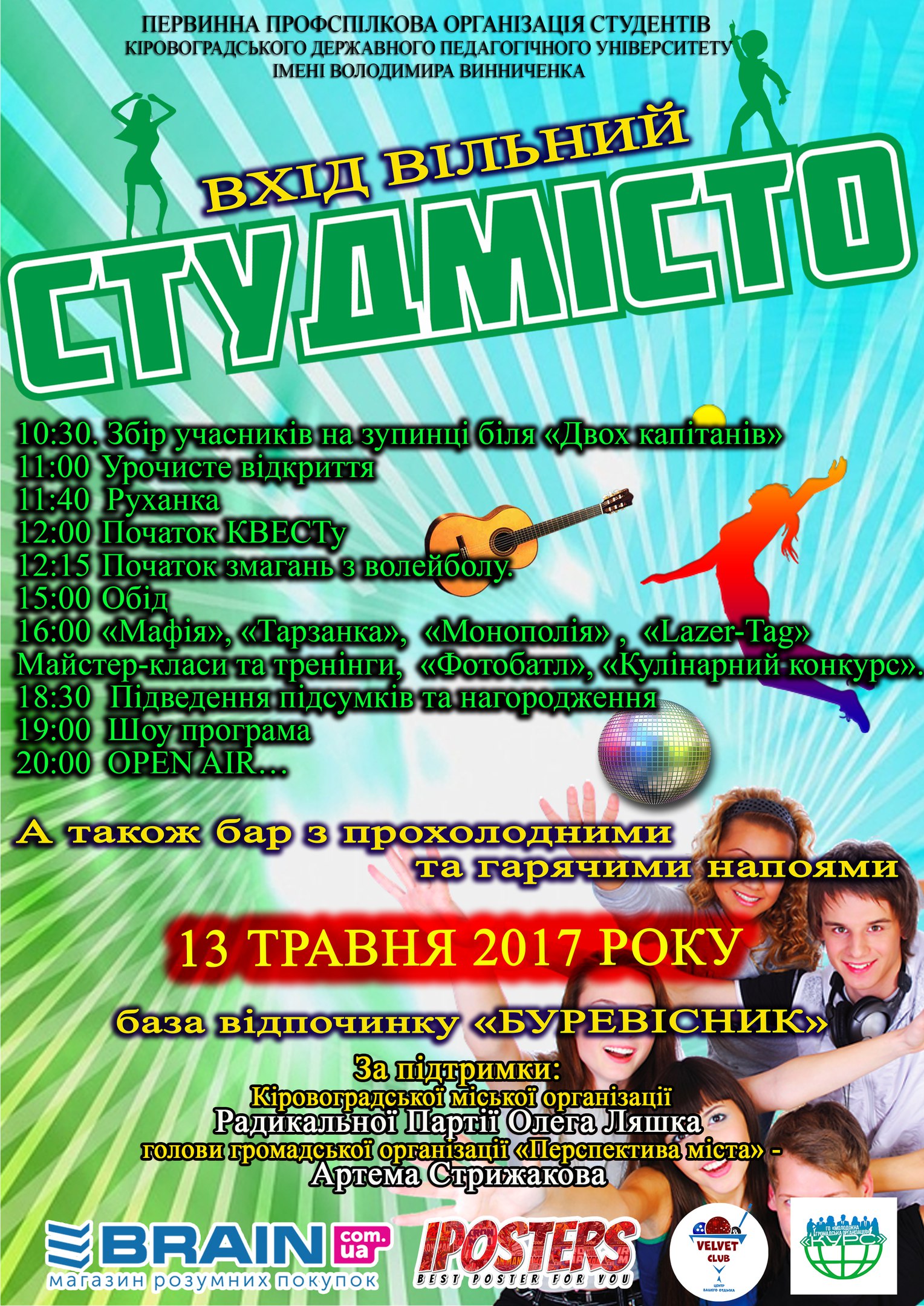 Семінари, екзамен, сесія — це важливо. Але іноді так хочеться просто побути на свіжому повітрі з одногрупниками, друзями. А якщо додати гарний настрій, цікаві спортивні квести, ігри, змагання, шоу-програму та дискотеку, то вийде ідеальне студентське життя. Ось так профком студентів ЦДПУ ім. В. Винниченка вирішив укотре виконати бажання. Щорічне свято “Студмісто” чекає на тебе 13 травня з оновленною та цікавою прграмою. Тепер ти можеш виграти у “Фотобатлі”, конкурсі Відеороликів та грі “Мафії”.