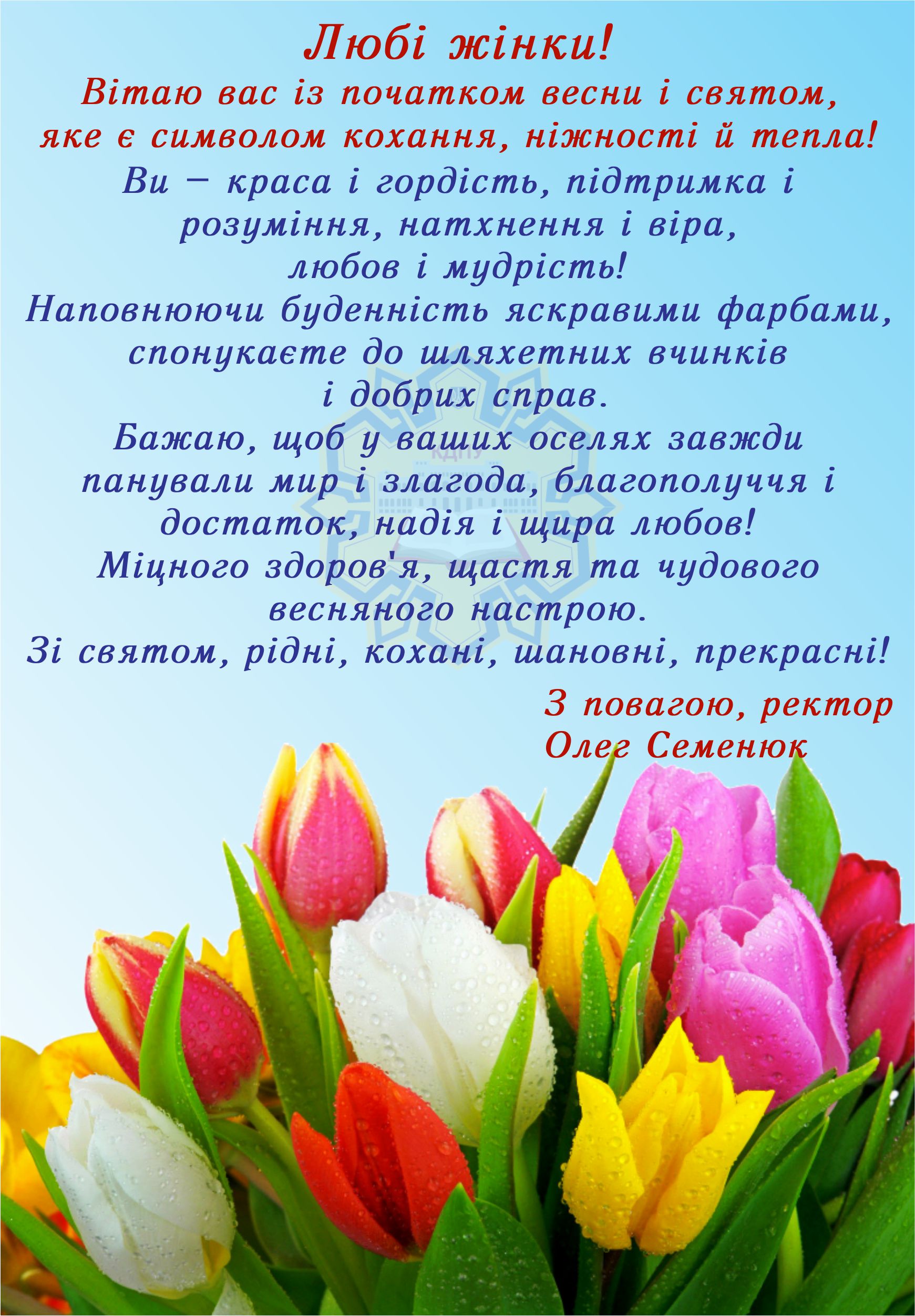 Восьме березня... Як багато означає воно для чарівної половини людства. Саме так починається краса...Краса у всьому: краса розквіту землі, кохання, краса у ніжності дівчат, у чарівності та загадковості жінок. Дівчина, жінка... Одним поглядом в силі викликає велике почуття . Одним махом брови розвіює його на порох. Цей день повертає тепло, радість, промені сонця,тому не дивно, що до цього свята у Кіровоградському державному педагогічному університеті імені Володимира Винниченка готуються по-особливому.
