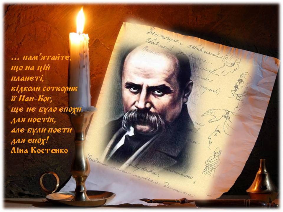 Є в українській літературі імена, що увібрали в себе живу душу народу, стали часткою його життя. Таким ім’ям стало ім’я Тараса Григоровича Шевченка, чия поезія от уже понад сто років викликає в людях почуття гордості і захоплення красою, своєю силою і народною мудрістю. Тарас Шевченко лишив нам свої слова – заповіти, які допомагають нам жити. Їх називають золотими словами Шевченка.