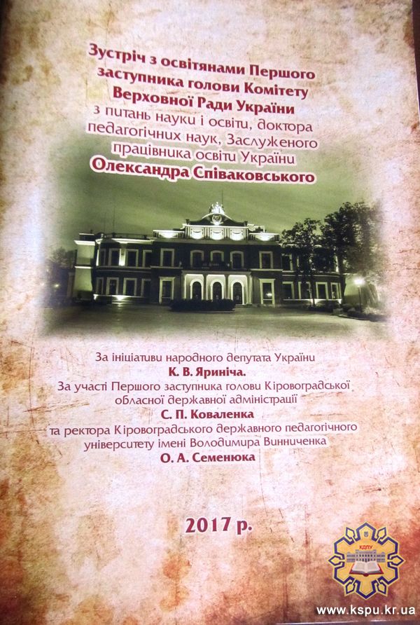 17 березня в педагогічному університеті імені Володимира Винниченка відбулася зустріч Першого заступника голови комітету Верховної Ради України з питань науки і освіти Олександра Співаковського з освітянами. На неї було запрошено членів вченої ради педуніверситету, директорів коледжів та шкіл міста. Під час зустрічі обговорили актуальні проблеми законотворчого забезпечення реформування освіти, запрошені мали змогу безпосередньо поставити питання людині, яка дотична до перебудови освітньої сфери.