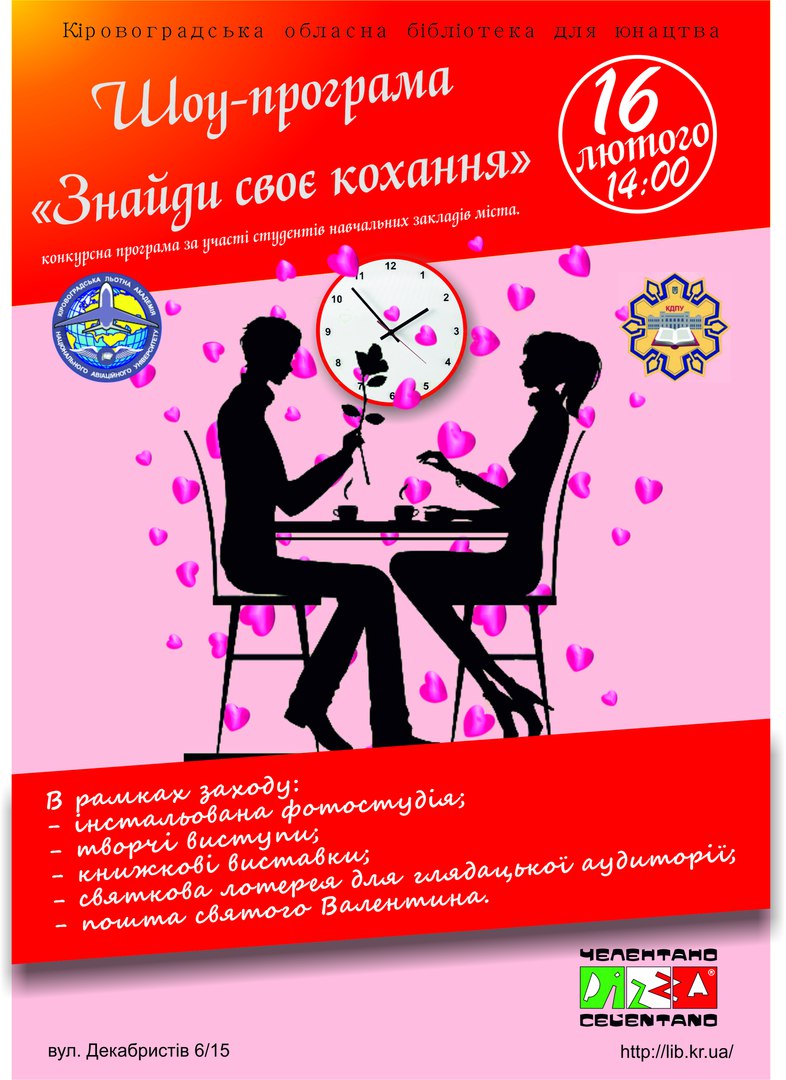 У четвер 16 лютого о 14:00 в бібліотеці для юнацтва (колишня ім.Бойченка) з нагоди дня Святого Валентина відбудеться шоу-програма "Знайди своє кохання" між дівчатами філологічного факультету Кіровоградського державного педагогічного університету імені Володимира Винниченка та хлопцями КЛА НАУ (льотна академія). Формат гри нагадує відому всім телепередачу "Кохання з першого погляду". До цього дня учасники не були знайомі між собою! У цьому й полягає головна інтрига заходу — чи знайдуть вони взаємну симпатіюі чи співпаде хоча б одна пара?! Переможці отримають романтичну вечерю в "Челентано" та два квитки в кінотеатр "Портал"!