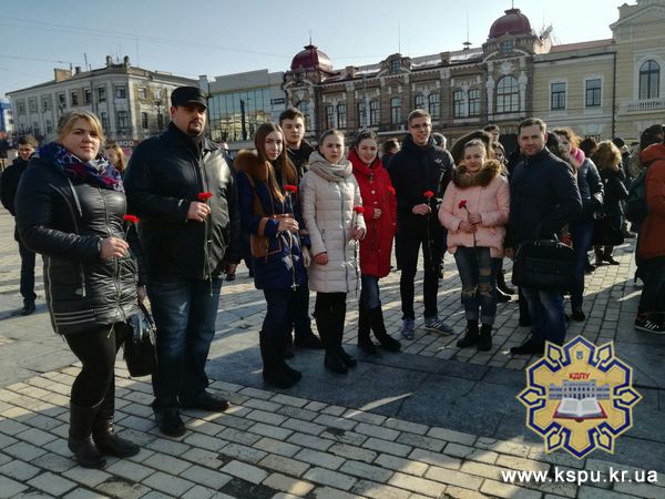 Сьогодні, 20 лютого, на площі Героїв Майдану вшановували пам'ять Героїв Небесної Сотні. Студенти Кіровоградського державного педагогічного університету імені Володимира Винниченка, зокрема, студенти факультеті історії та права, долучилися до мітингу та поклали квіти до пам'яної дошки зі світлинами Героя України Віктора Чміленка.