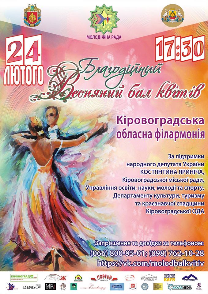 24 лютого запрошуємо на Благодійний весняний бал, який відбудеться у холі Кіровоградської обласної філармонії о 17.30. Про це повідомили організатори балу представники Молодіжної ради при виконкомі та студентки педагогічного університету Ганна Трушевич та Катерина Колєва.