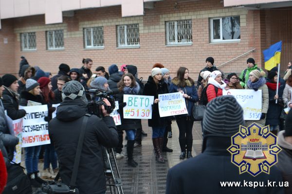 Вчора, 20 грудня, на площі біля пам`ятника В. Винниченка студенти Кіровоградського державного педагогічного університету імені Володимира Винниченка вийшли на акцію протесту, під час якої висловили свою думку про нову Постанову КМУ «Про внесення змін до стипендіального забезпечення». Акцію назвали: «Спасем образование - #5130 вето». До мітингу долучилися інші ВНЗ, а саме: Донецький медичний університет, Кіровоградська льотна академія Національного авіаційного університету та Центрально-український національний технічний університет.