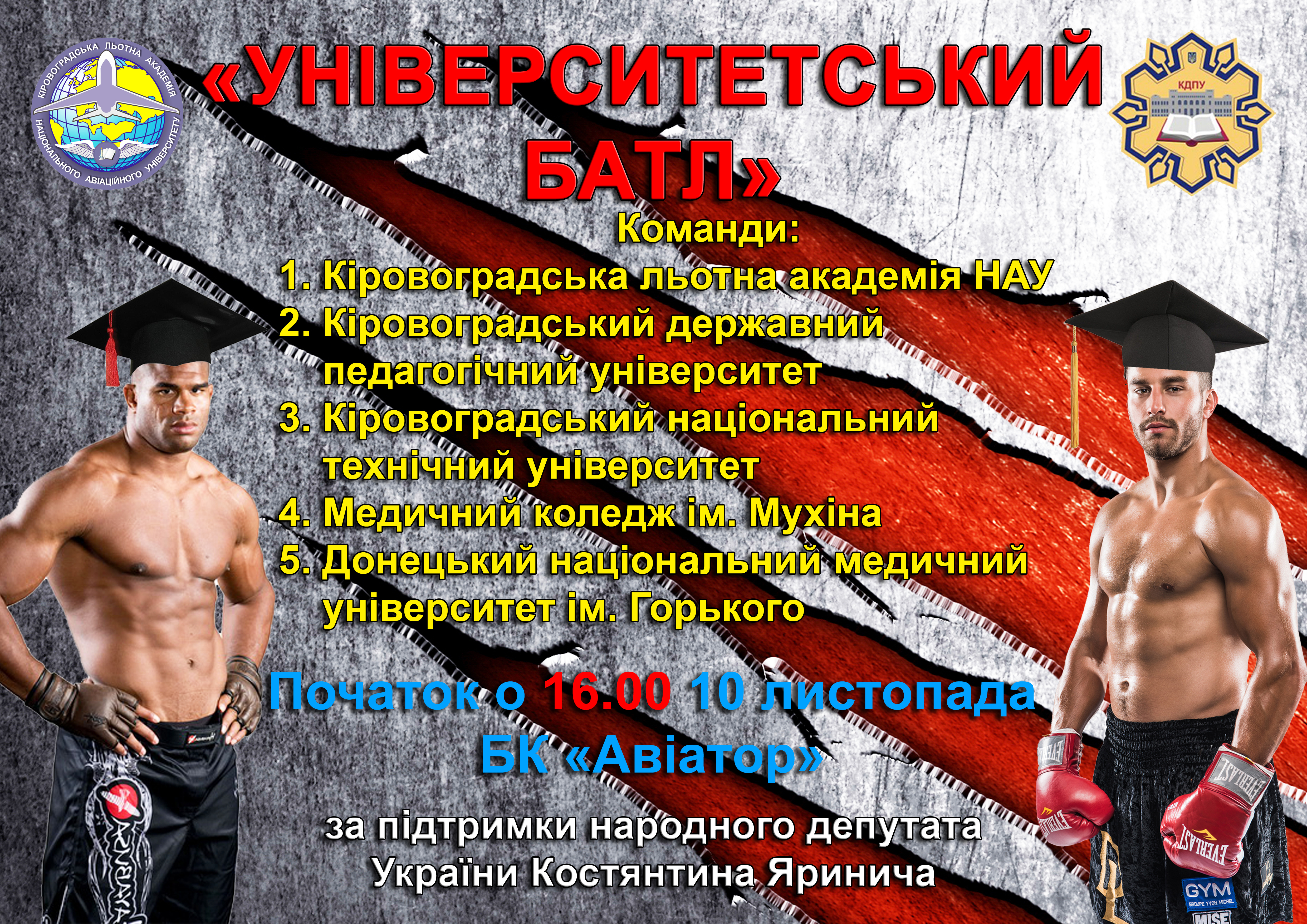 Шановні друзі, Кіровоградський державний педагогічний університет імені Володимира Винниченка та Кіровоградська льотна академія НАУ запрошують вас на перший в місті "Університетський батл" до Міжнародного дня студента!