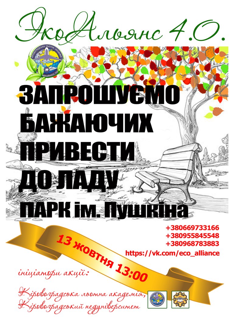13 жовтня о 13 годині КДПУ ім. В. Винниченка спільно з КЛАУ НАУ запрошують Вас прийняти участь в рамках проекту"Еко альянс 4.0". В четверг студентами, курсантами разом з ректоратом буде висаджено 15 садженців для краси та очищення довкілля.