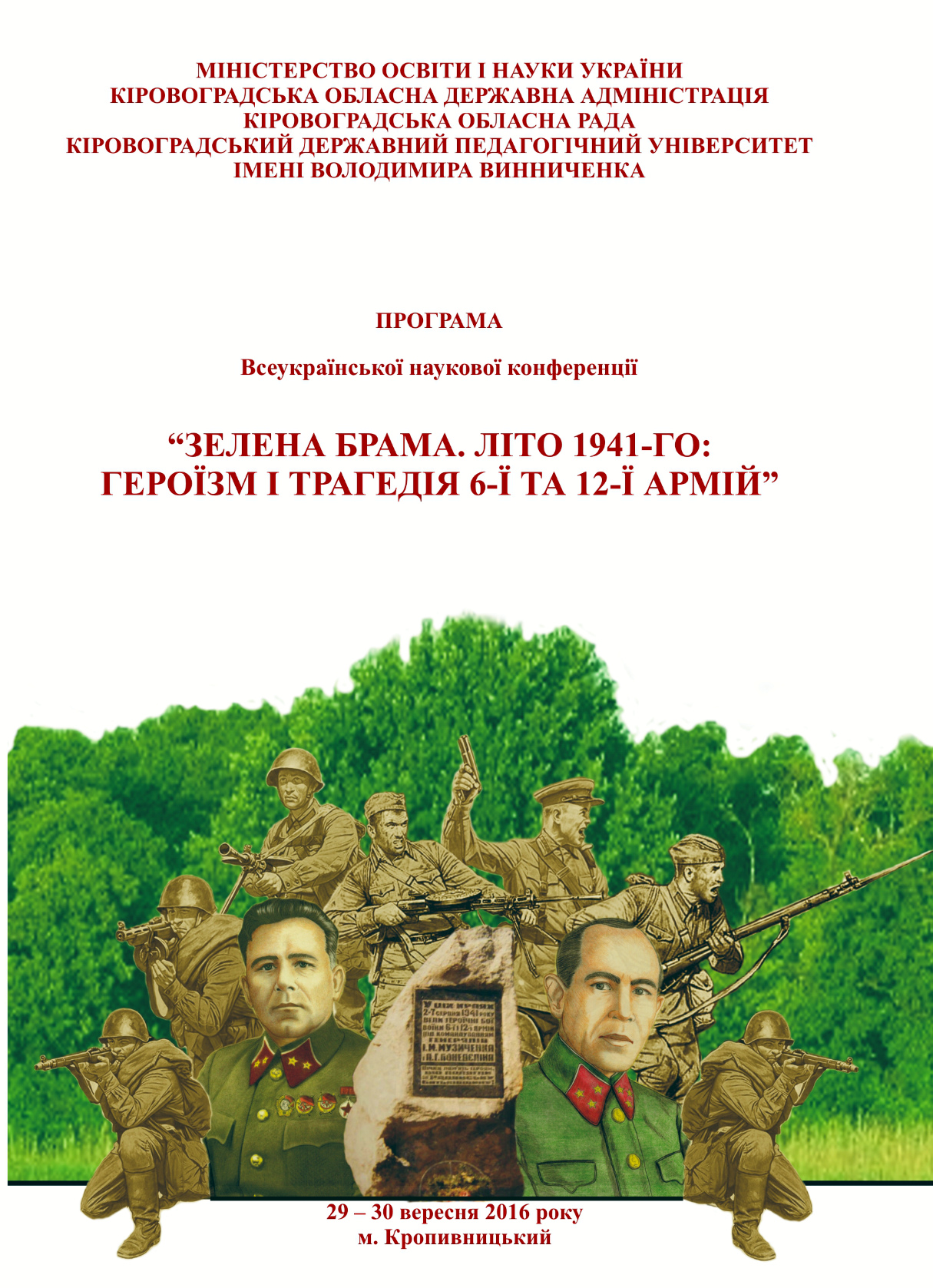 Запрошуємо гостей, викладачів та студентів! 29-30 вересня у Кіровоградському державному педагогічному університеті імені В. Винниченка відбудеться Всеукраїнська наукова конференція: “ЗЕЛЕНА БРАМА. ЛІТО 1941-ГО: ГЕРОЇЗМ І ТРАГЕДІЯ 6-Ї ТА 12-Ї АРМІЙ” в залі засідань КДПУ ім. В. Винниченка.