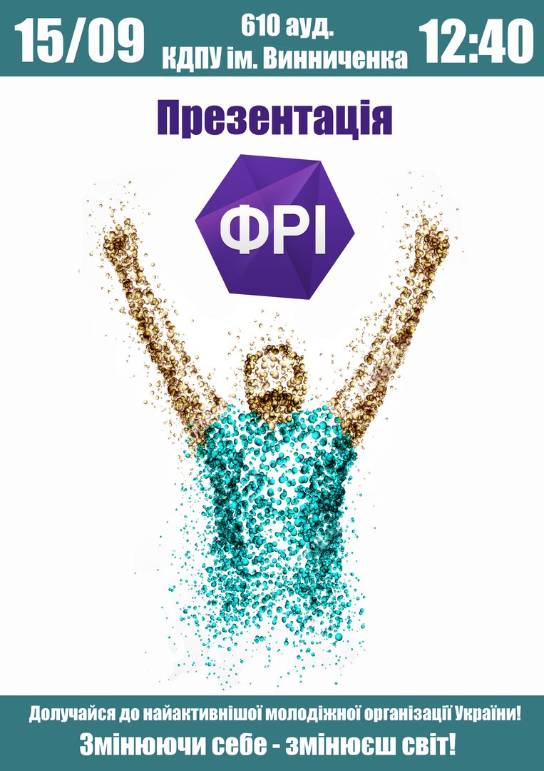 15 вересня у 610 аудиторії КДПУ ім. Винниченка пройде презентація Фундації Регіональних Ініціатив. Тут студенти отримають змогу дізнатися від Голови організації та студента університету про діяльність ФРІ за минулий рік. За її успіхи та майбутні перспективи. На презентації будуть анонсовані майбутні заходи з можливістю долучитися до їх організації або першими записатись у учасники.