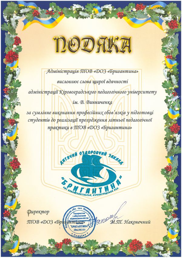 Багато років ректорат Кіровоградського державного педагогічного університету імені Володимира Винниченка співпрацює з керівництвом дитячого оздоровчого закладу «Бригантина», що знаходиться в смт. Новоархангельськ Кіровоградської області.
