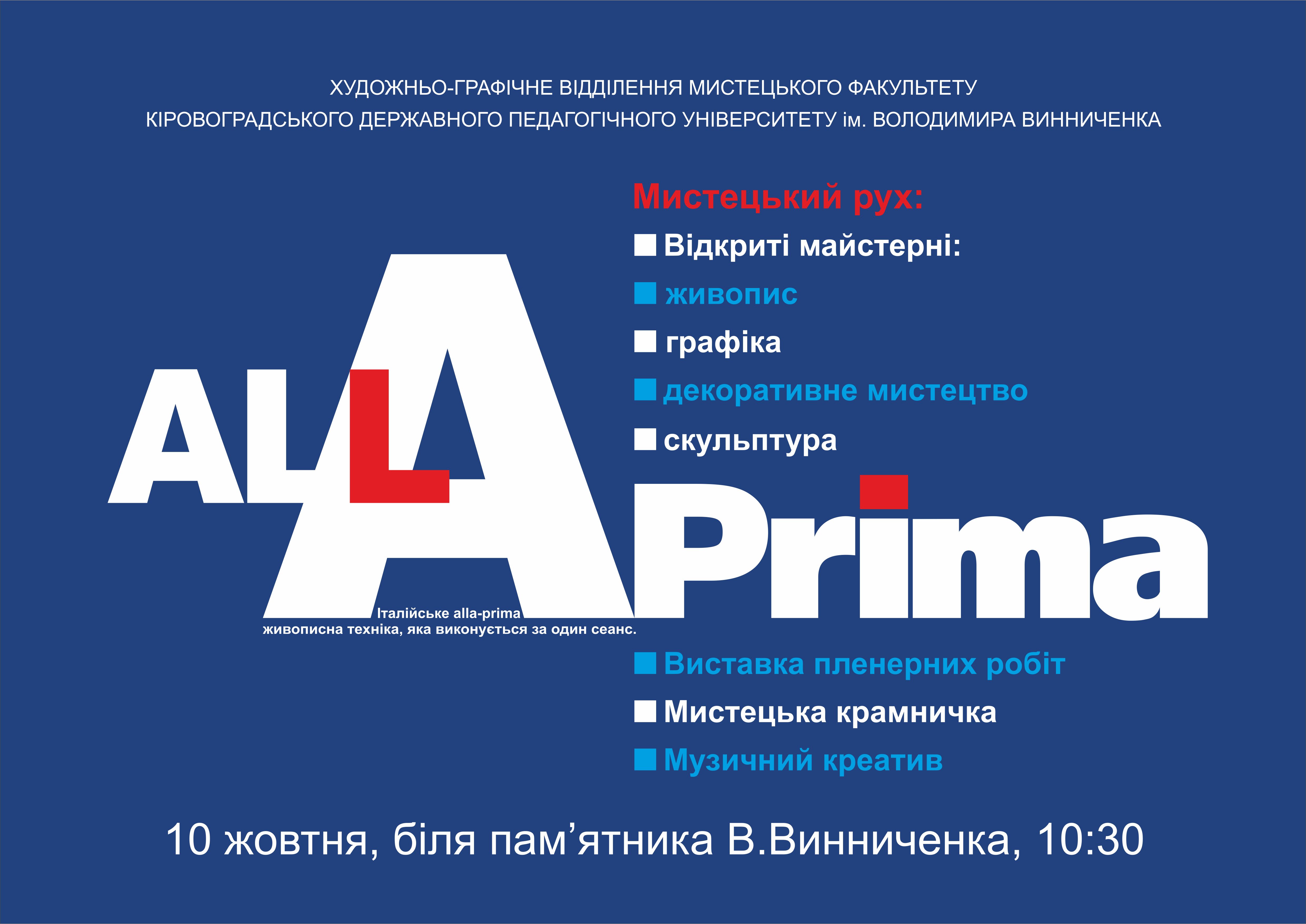 Студенти та викладачі художньо-графічного відділення мистецького факультету запрошують усіх бажаючих взяти участь у мистецькому русі «ALLA PRIMA», присвяченому Дню художника. Захід відбудеться 10 жовтня 2015 року о 10:30 біля пам'ятника В. Винниченка (вул. Шевченка, 1).