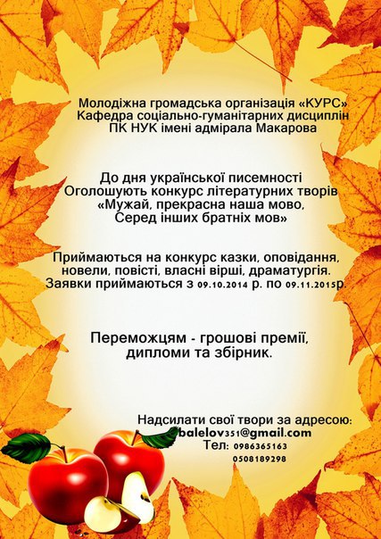 Молодіжна громадська організація «КУРС» (керівник Микола Балєлов, студент фізико-математичного факультету) спільно з кафедрою соціально-гуманітарних дисциплін ПК НУК імені адмірала Макарова оголошують конкурс літературних творів до Дня української писемності та мови -«Мужай прекрасна наша мово, серед інших братніх мов».