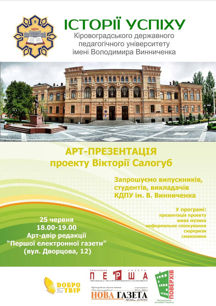 25 червня о 18.00 за адресою вул. Дворцова, 12 відбудеться арт-презентація проекту «Історії успіху» КДПУ ім. В. Винниченка. «Історії успіху» – це конденсат досвіду випускників з різних факультетів.