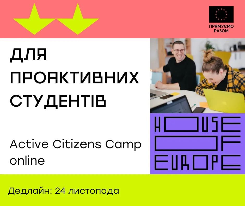 House of Europe запрошує проактивних студентів приєднатися до Active Citizens Camp, щоб зустріти молодих лідерів з усієї України та навчитися згуртовувати людей навколо корисних проєктів.