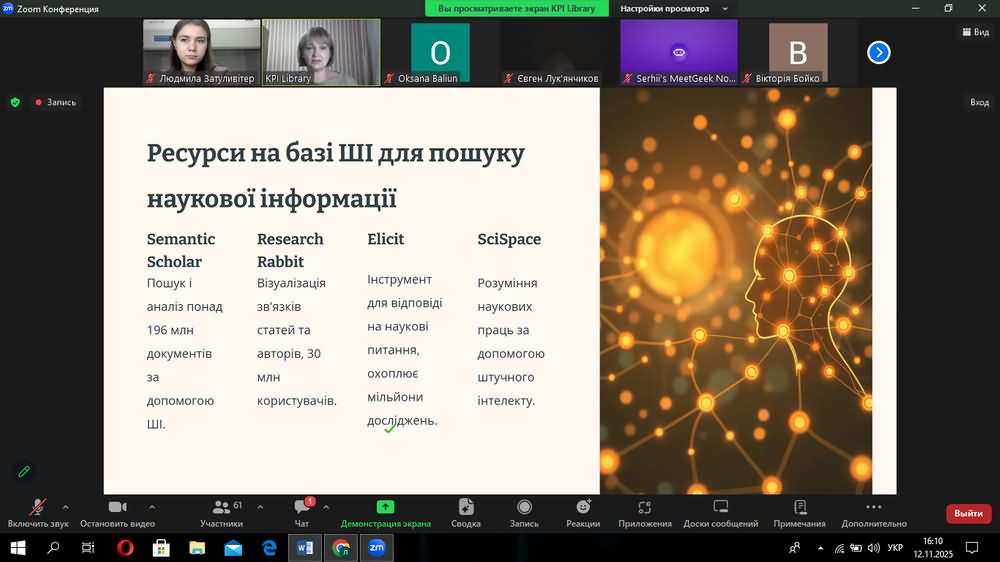 У 12 листопада 2025 року здобувачі освіти другого (магістерського) рівня вищої освіти ОП Середня освіта (Біологія та здоров’я людини, Хімія) В. Бойко, Л.Затуливітер та К.Тимкович взяли участь в онлайн-лекції «Пошук освітніх та наукових джерел з використаннямтехнологій ШІ», яка відбулася у межах курсу «Must-have для дослідницької діяльності».