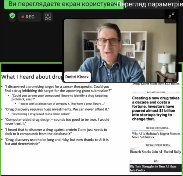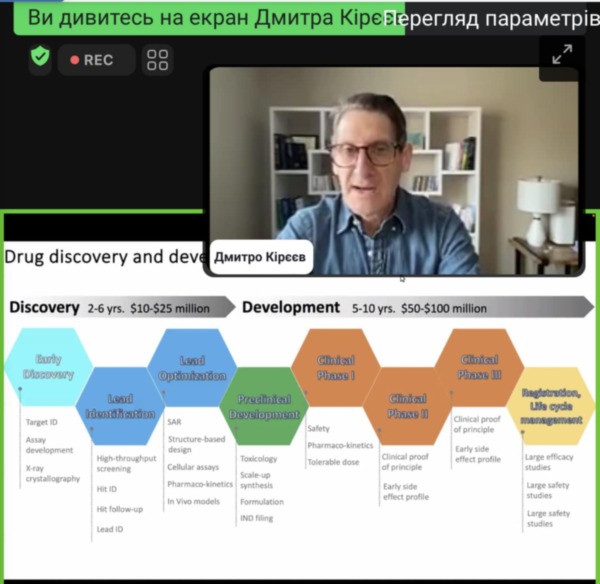 Лектор ознайомив присутніх з етапами розробки лікарських препаратів, поняттям молекулярного докінгу, можливостями комп’ютерної хімії в розробці ліків. Зокрема, автором лекції наголошено, що етап відкриття (передбачає синтез, ідентифікація, оптимізація) триває 2 – 6 років і його вартість складає 10–25 млн доларів; етап розвитку (передбачає клінічні дослідження і реєстрацію препарату) триває 5–10 років, а його вартість складає 50–100 млн доларів. Окрема увага приділена використанню штучного інтелекту в цій галузі. Після лекції Dmitri Kireev надавав відповіді на питання, які з'явилися у слухачів під час ознайомлення з представленими матеріалами.