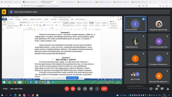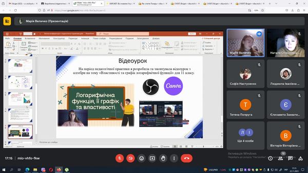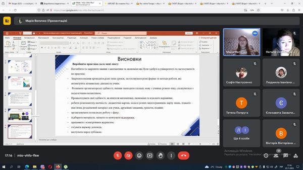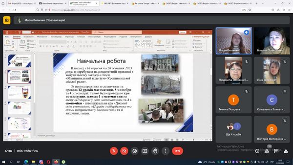 Марія Олексіївна Величко схарактеризувала особливості проходження педагогічної практики у КЗ «Ліцей «Муніципальний колегіум» Кропивницької міської ради». Зокрема, розповіла про цікаві позакласні заходи з математики та економіки, про застосування інтегративного підходу у процесі навчання старшокласників: