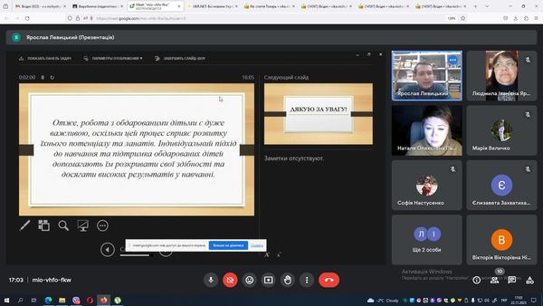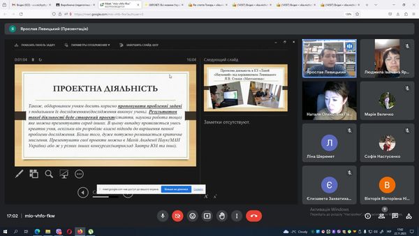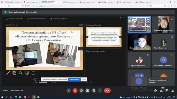 Першим представив свою доповідь Ярослав В’ячеславович Левицький, він розповів про особливості організації навчання обдарованих дітей та ознайомив присутніх із проєктною діяльністю, яку він, як вчитель математики, здійснює в КЗ «Ліцей «Науковий» Міської ради міста Кропивницького» в межах секції «Математика»: