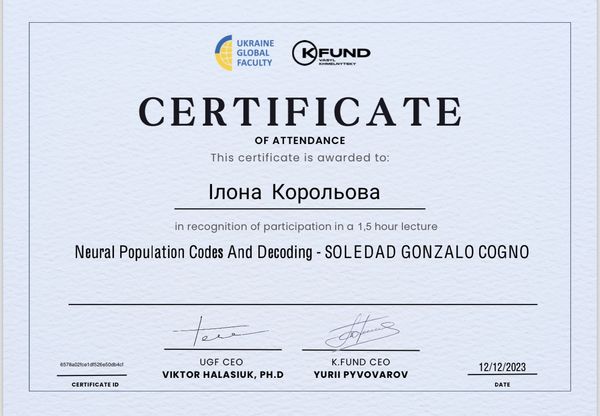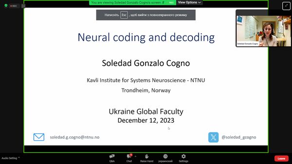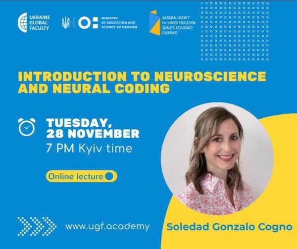 28 листопада 2023 року здобувачі освіти спеціальності 014 Середня освіта (Природничі науки) змогли прослухати лекцію наукової співробітниці та керівниці дослідницької групи в Інститут системної нейронауки ім. Кавлі Норвезького університету науки і технологій, PhD у галузі комп'ютерної нейронауки Soledad Gonzalo Cogno – «Introduction To Neuroscience And Neural Coding». Soledad Gonzalo Cogno — працювала та навчалася в лабораторії Мей-Брітт Мозер та Едварда Мозера, лауреатів Нобелівської премії з фізіології та медицини 2014 року. Авторка досліджує, як активність окремих нейронів координується на рівні нейронної мережі, і як ця координація впливає на пізнання та поведінку людини. Для реалізації своєї наукової мети вона поєднує свій досвід у галузі комп'ютерної нейробіології з найсучаснішими методами фіксації великих популяцій нейронів.