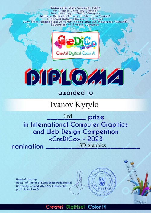 Кирило Іванов – студент спеціальності Професійна освіта (Цифрові технології) Центральноукраїнського державного університету імені Володимира Винниченка отримав диплом за зайняте ІІІ місце у Міжнародному конкурсі з комп’ютерної графіки та вебдизайну «CreDiCo»-2023 номінація «3D-графіка». Наставниками Кирила стали викладачі кафедри математики та цифрових технологій: д.пед.н., проф. М.І.Садовий, к.пед.н. Д.В.Соменко, д.пед.н., проф. О.М.Трифонова (науковий керівник).